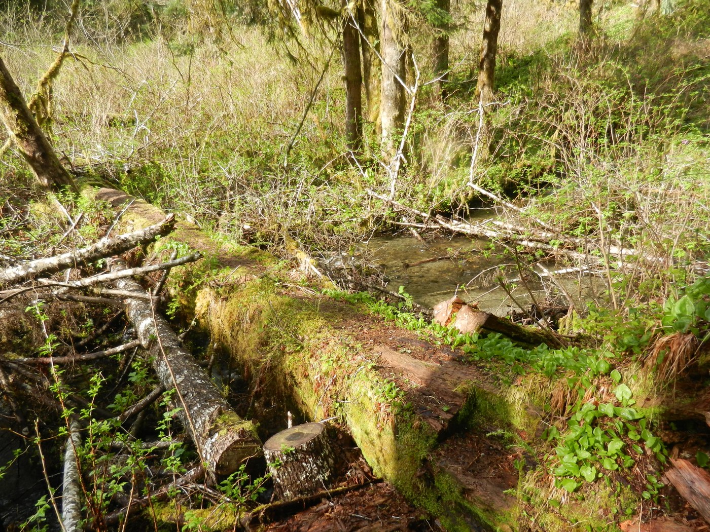 Drove up the Middle Fork Road out of North Bend to hike the Sitka Spruce Trail from the Middle Fork Road up to the CCC Road-Trail. I had not done this trail before, so wanted to do a new one. Parked at the wide area on the south side of the "Big Concrete Bridge" that crosses the Middle Fork Snoqualmie River. The Sitka Spruce Trail starts on the north end of the bridge and heads westerly through a stand of old growth Sitka Spruce trees. The trail goes down an embankment and soon crosses a small creek on the log bridge with a railing. Part of the log is getting pretty rotten. The trail stays fairly flat to the second creek crossing as it passes many large spruce and big leaf maple trees. There are some really big old growth vine maple trees too. There is a nice log with chicken wire on top over the second creek, then the trail goes up steeply a short distance to another flat area. Further on the trail gets to the third creek with a large log to hike across. Then the trail heads up steeply again and follows a ridge top to an old DNR logging road that is now just a trail. This part of the trail goes gently uphill for about 1/3 mile, then leaves the old road and switch backs steeply up through second growth conifer before ending at the CCC Road-Trail. There are a few muddy/wet areas along the way, but easy to get by.
