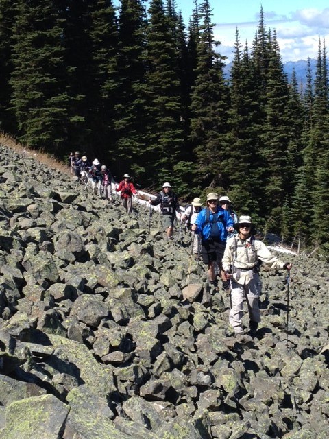 The trail is best accessed via Spring Cr Rd 1705 near Whistling Jack on Hiway 410. Follow 1705 and 1703 for 9.2 miles to the trail head which is marked by a backwoods road sign and information station. Things to consider: 1. Elevation between and 5-6,000 feet so it can still be chilly at times. 2. This area has multiple intersecting roads/jeep trails so map reading skills are critical and GPS very helpful if you plan to explore the area between the trail head and Manastash Ridge. 3. Roads are generally not well marked and numbers may differ from your map. 4. The bush whacking and cross country route finding described in this hike may not be for everyone. Steep slopes/scree slopes/etc. The more direct route to the meadow/elk camp noted below is an easier alternative. Our Hike: 1.Departing the trail head, we spent time at Devil's Slide where we saw a dozen or more goats. Also saw several elk. 2. Continuing up the trail, we took the first major logging spur to the left(note-going straight ahead takes you to a large meadow/elk camp from which you can go right to the old lookout site or left to Manastash Ridge) 3. The logging spur ends at a knob listed as 6035 on Greentrails 273. 4. From this point we bush whacked NE and dropped in elevation to a logging spur at the head of Milk Cr. 5. We then headed generally west on logging roads until just north of Milk Lk where we then followed roads and jeep trails to the summit of Manastash Ridge about due west of Manastash Lk. 6. Heading south east along the ridge line we took a side trip to the rocks above Manastash Lk. These rock formations and associated meadows are worth the trip. 7. We then followed the ridge back generally south regaining the Gold Cr trail at the meadow/elk camp noted above, we returned to the trail head. Total mileage-11, gain 2800'