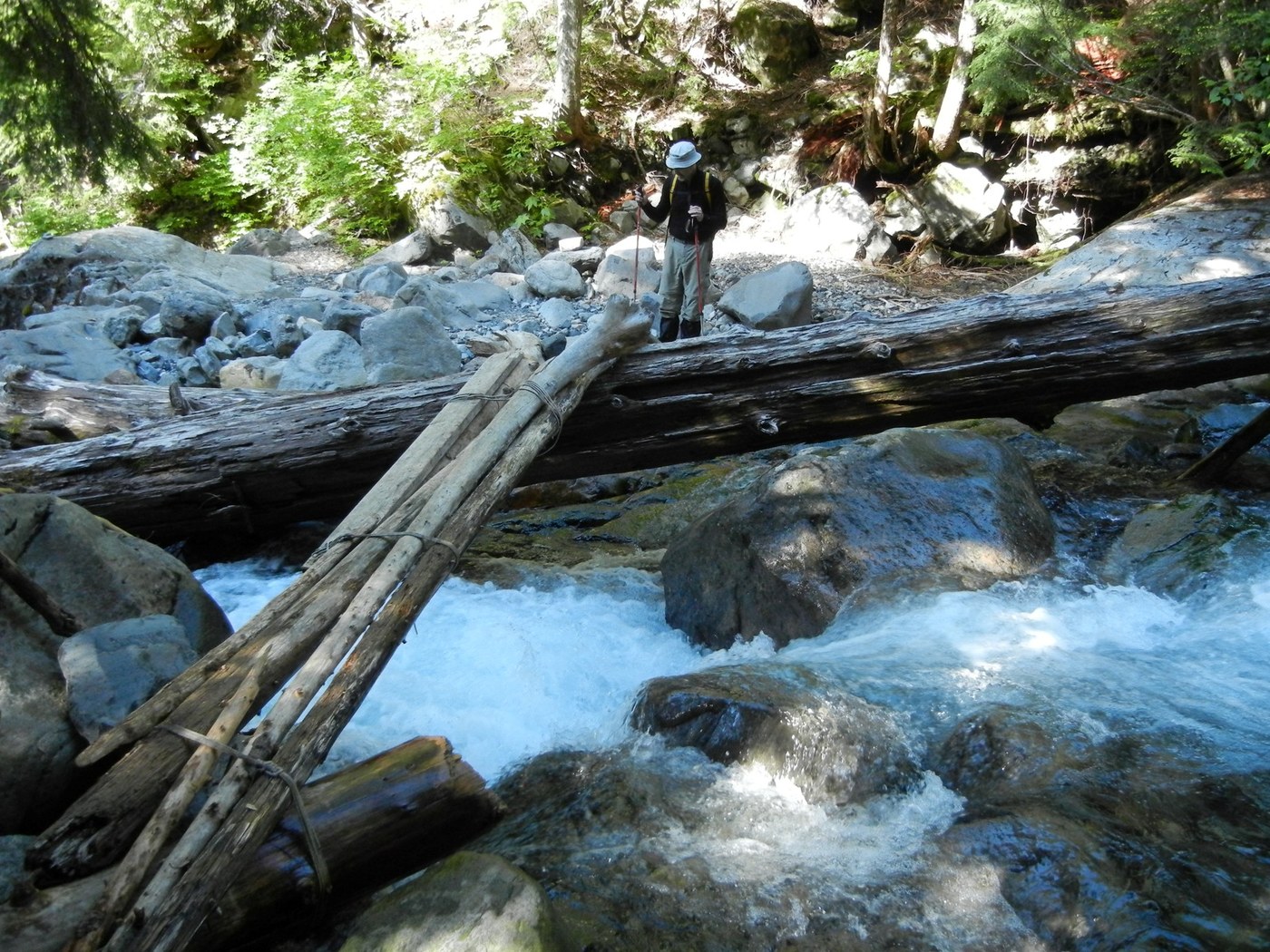 Vesper Peak is quite challenging this year with mostly snow above 3500'. Trail #707 is easy to follow into the basin and the only obstacles, before the basin, are the five rushing-stream crossings. Some have small logs and rocks to cross on but the biggest crossing has small logs lashed together. In the morning the logs were wet and hazardous to cross but in the evening they were dry and much less a hazard. For either time trekking poles were extremely helpful. The trail ends where snow starts in the basin, and continues all the way to Headlee Pass (4800'). We put away the poles and used axe's to climb the very steep slope to Headlee, after determining which gulley was the correct one. Beyond Headlee was a brief bare trail on the west side. We traversed on snow and rock below Sperry's steep slope. Watch for post-holing when transitioning from snow to rock. Beyond Sperry and the lake basin there is a long, steep snow-climb directly to the summit. It was a warm, sunny day so the snow was soft and crampons were never needed but gaiters were.