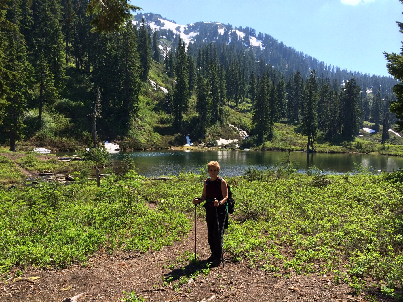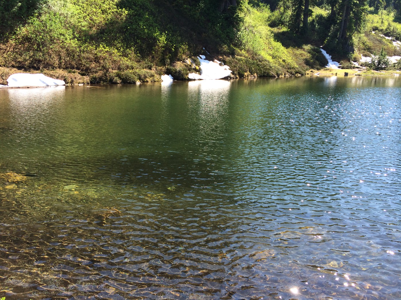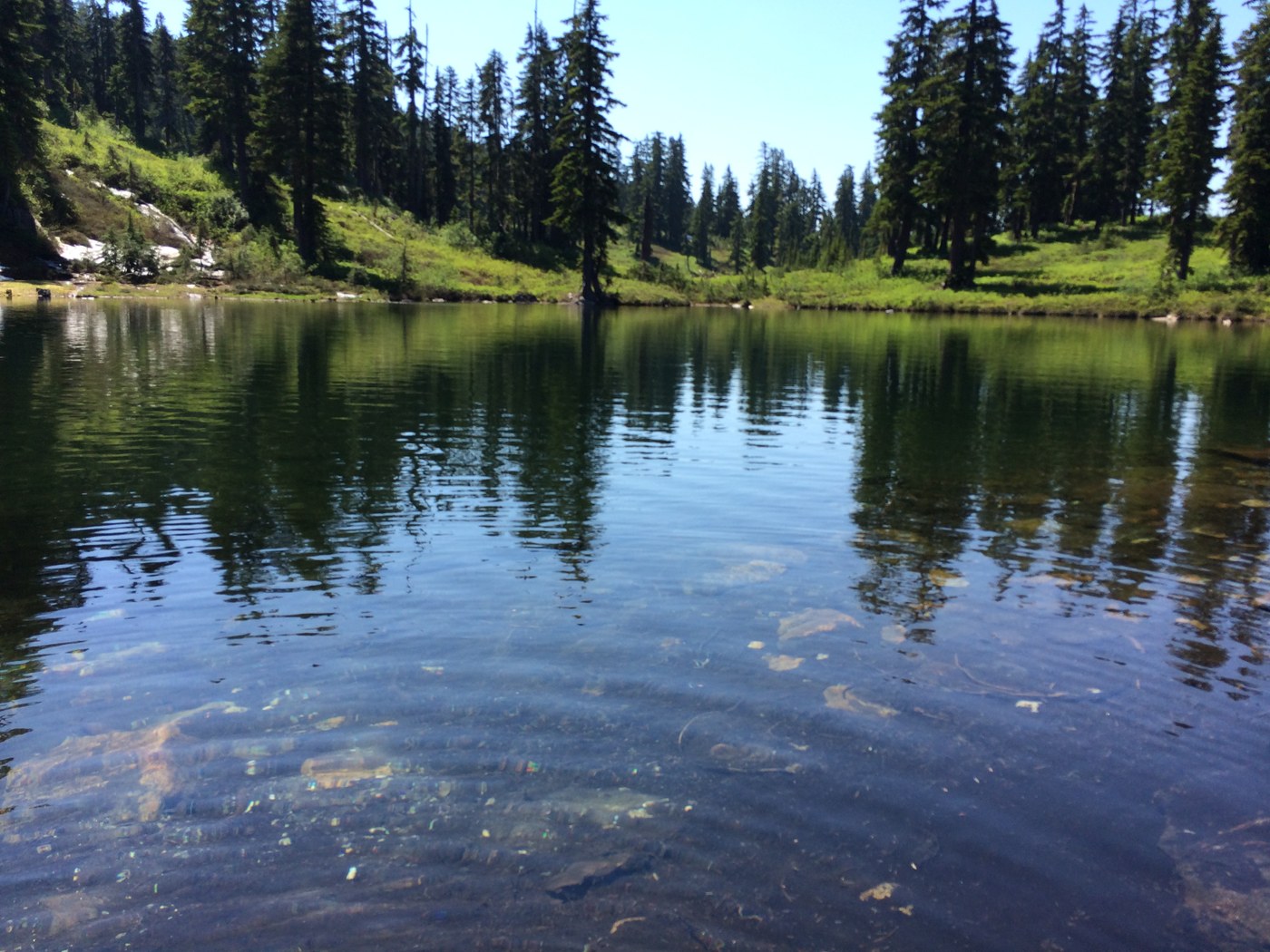 At 3.5 miles is the ford across Meadow Creek. If you don't want to get your feet wet, there are a few logs a bit upstream that you can use to make way across without any difficulty though there is a bunch of devils club that are near those logs at the other end. There is still some snow patches after the ford and hopefully you will have saved some energy as the second climb to the ponds begins, some fairly steep sections. At least this section offer a few views of the meadows and some peak. About a 3/4 mile from the lower pond there is some snow that you have to negotiate in order to find the trail further down. Just walk around and find the trail again, you shouldn't get lost. Then thinking your near the ponds on a straight section has you fooled as you have to go another 0.5 miles and descend a bit and you can see the lower pond, which is beautiful and worth the long hike in.