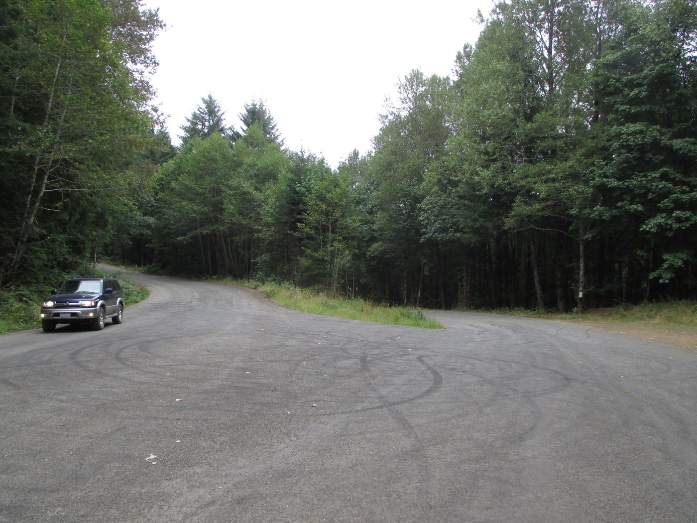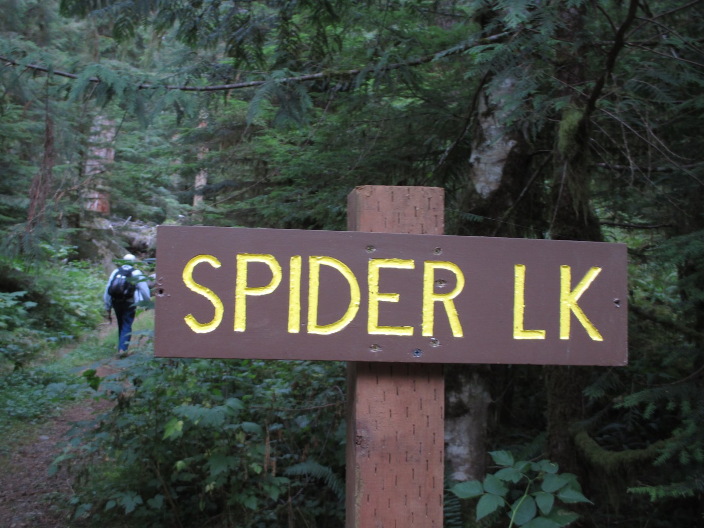 GETTING THERE: Follow Skokomish Valley Road 5.5 miles and bear right at V intersection onto Forest Road 23. Follow FS 23 for 9.5 miles to a V- junction where you'll see a sign for Brown Creek CG, Skokomish Trail, and High Steel Bridge (see photo below). DO NOT take follow that road, but take the left side of the V, which is not marked for Spider Lake or anywhere else! You'll come to another V-junction--veer right (the left side is FS 2356, but that sign is down the road a bit, not at the junction). You'll see a new sign for SPIDER LK on the left side of the road (see photo below). There is a pull-out on the right just past the sign. The map in the Olympic Forest book marks a trail head on the southwest side of the lake, but the trail head is actually where the map shows "23" (the forest road) on the north side of the lake.