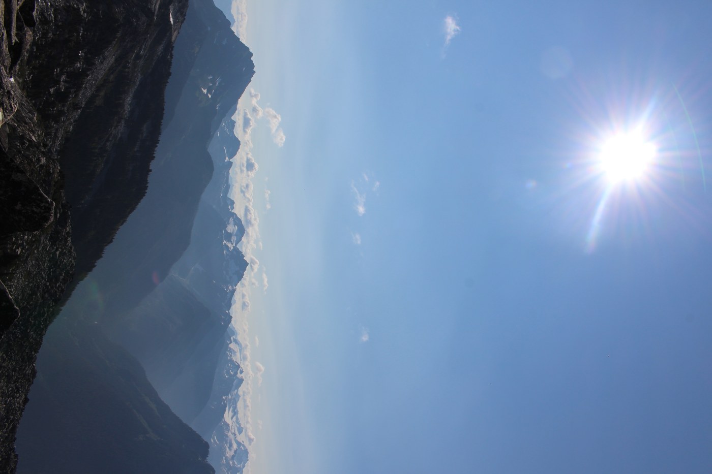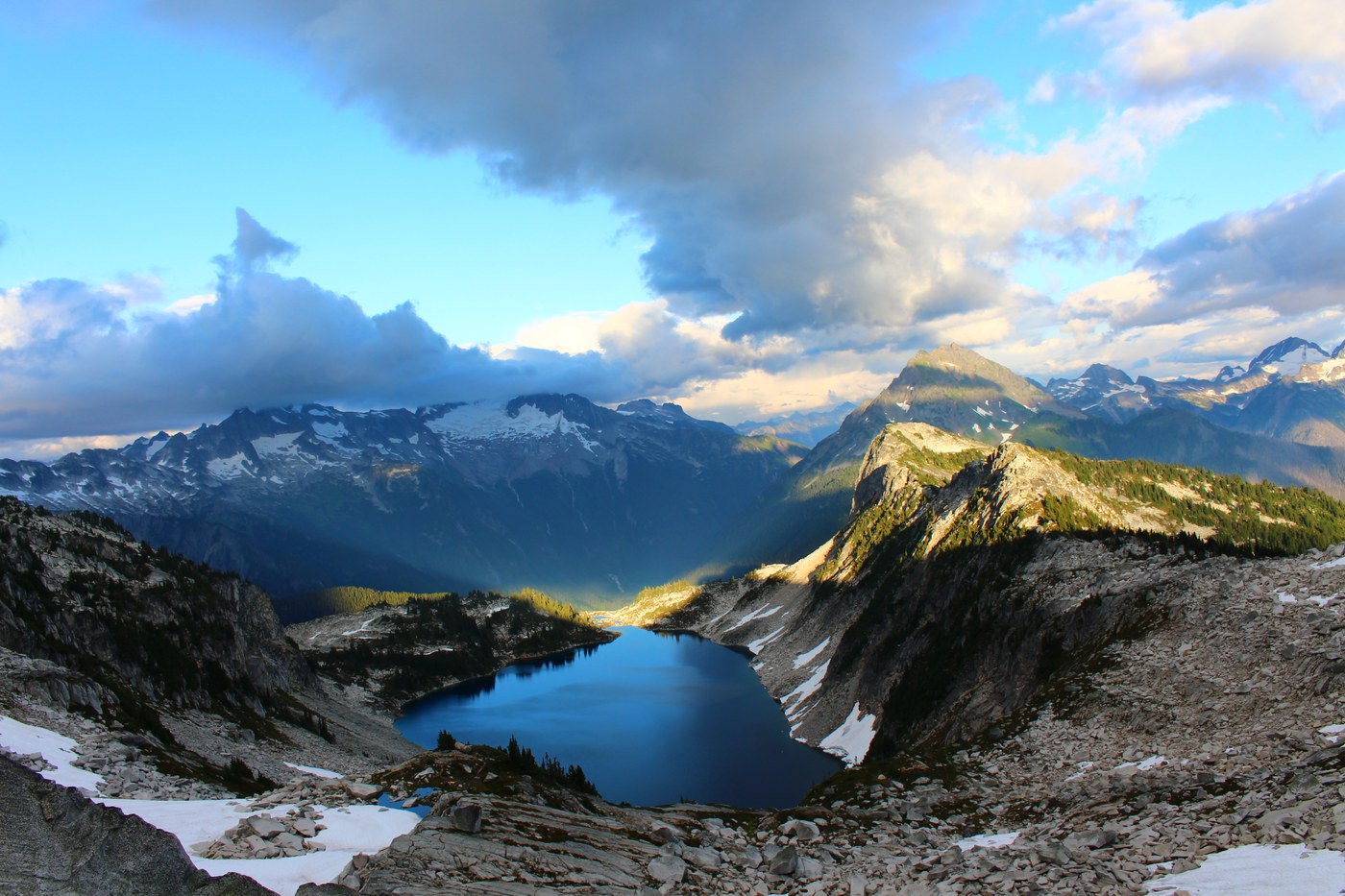 4 miles to the ridge line and stop in awe at the gorgeous Hidden Lake below. We'd already heard by the descending day hikers that the lookout was occupied so we started the decent to the lake. Boulder hopping down took ~30-45 minutes. Look for the cairns. We were one of 3 parties camping at the lake that night. It was chilly and got down to ~42. No rain, a beautiful sunset and sunrise made it all worth it. Too cold for bugs. Plenty of little areas to fill up water.