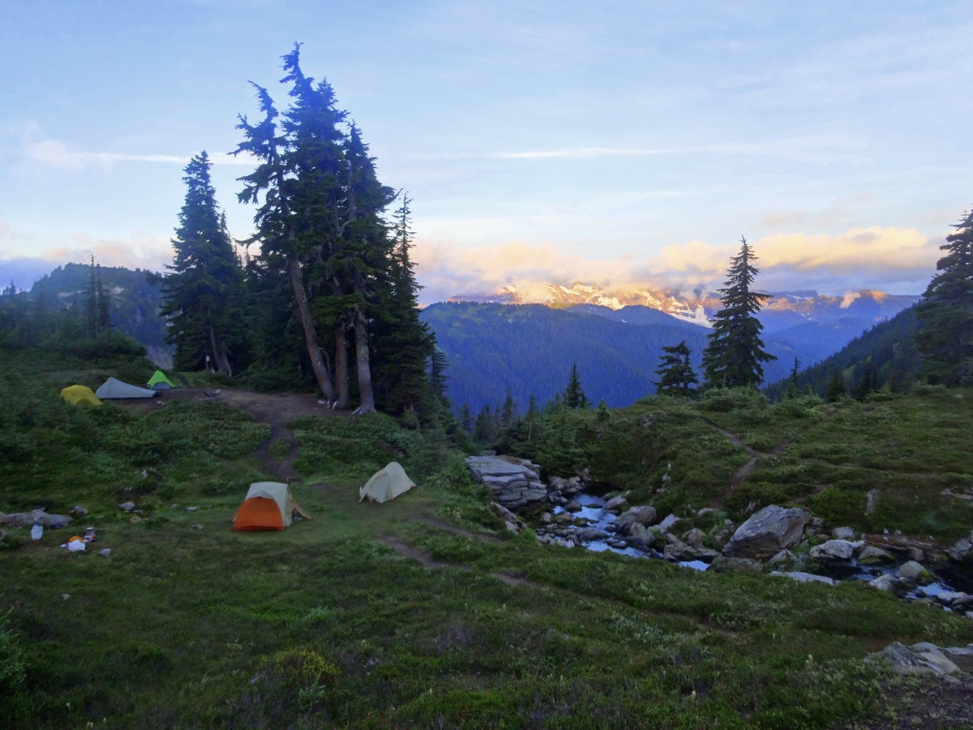 Finally after about 4 hours we began to break out of the trees into meadows with views of Keyes, Monte Cristo and Sloan Peaks. From here the views were broad and flowers profuse, if a bit past prime. We began to see Johnson Mountain ahead, traversed the meadows around it, and finally descended steeply to Blue Lake on its south side. Blue Lake had a privy, a couple of good 3-tent-sized sites and multiple smaller ones around a pretty reflective lake. The camp area we chose looked out over a west-facing dropoff and our sunset payoff was dramatic. Though the nominal gain for our Pilot Ridge day was just 4000 feet, based on our GPS track we had actually done 5200 feet that day, over 11.6 miles.