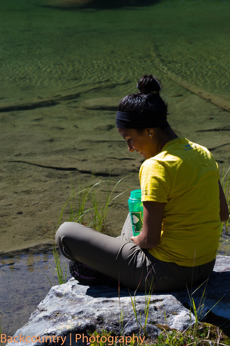 Got to the TH at about 1130-1145 and headed out, you cross a bridge immediately and then start a slow climb up into some switchbacks for about the first 3-ish miles, eventually topping out and coming across Squaw Lake. My girlfriend and I decided this was a good place for a powerbar and a break, so we dumped the packs and sat down for 10-15 mins to just soak in the relaxation. The trout were active that day and you could see them everywhere. The coolest part of this break was when the butterfly landed on my girlfriends knee, she had never had that happen and to see the look of enjoyment on her face was priceless, it was a really awesome nature moment that I'll never forget.