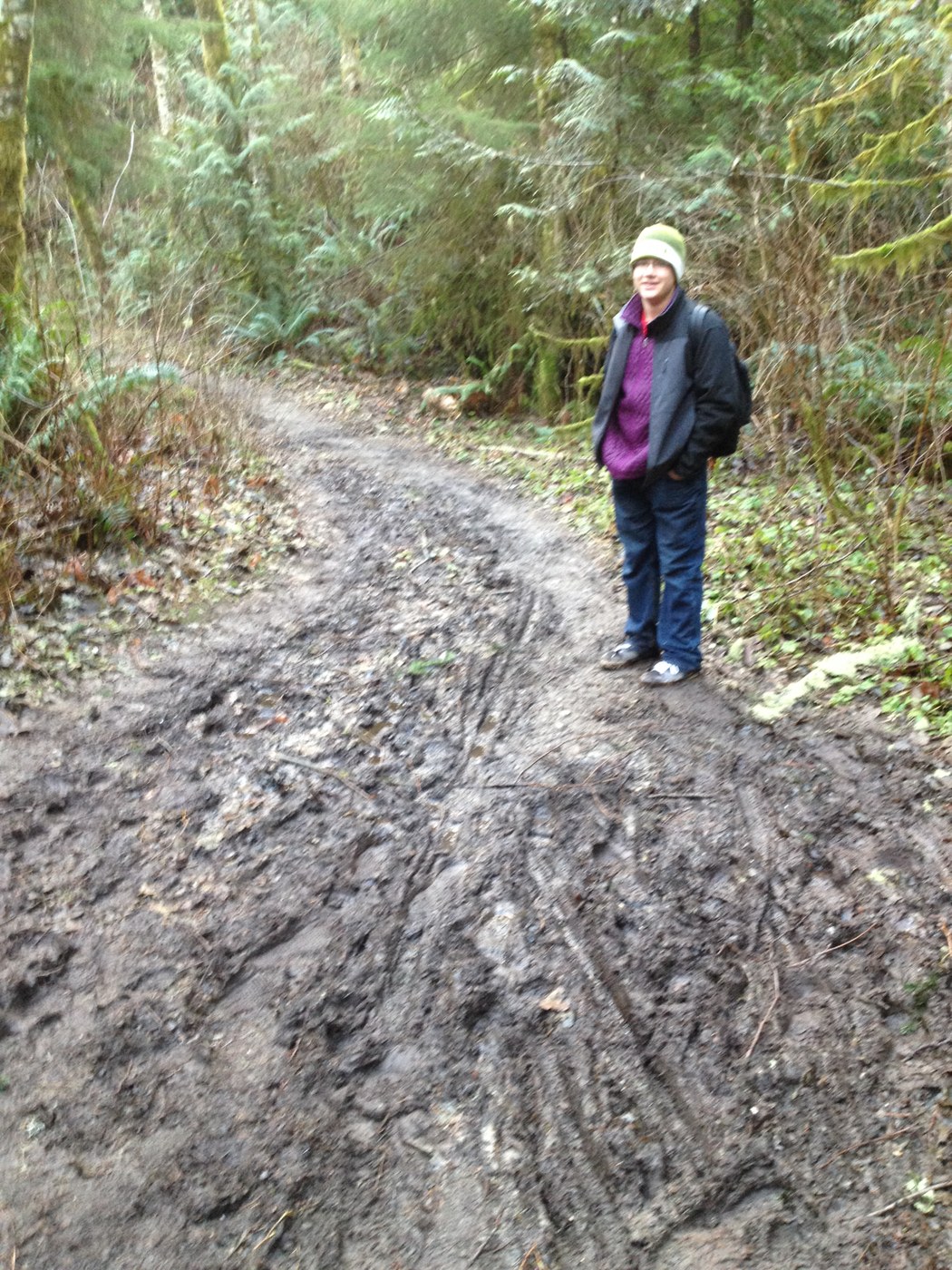 The upper portion of this hike was just wonderful. Seeing the amazing geology up close was really awe-inspiring, and I had many grateful thoughts to the souls who built this trail, especially the stairs! It was a dry day with mist among the trees which made it all the better. However, following the rock portion of the hike, we continued on to Lost Lake -- who wouldn't want to visit a Lost Lake?! The trail became progressively muddier and muddier. It was very slippery and we found ourselves slipping and sliding along, and though we considered turning around many times, we really wanted to see the lake and felt it would make a good lunch spot, so we persevered. The mud continued to get deeper and slippier. As we neared the lake, I slipped off a "bridge" of logs laying across an enormous and deep mud puddle. One leg fell in to the mid-calf; I consider myself lucky that I didn't lose my shoe! We reached the lake only to find that there really is no access and we had to bushwhack our way to the edge of the water just to get a glimpse. So our conclusion: definitely hike the upper trail, but skip the Lost Lake portion of the hike, at least in conditions such as we encountered.