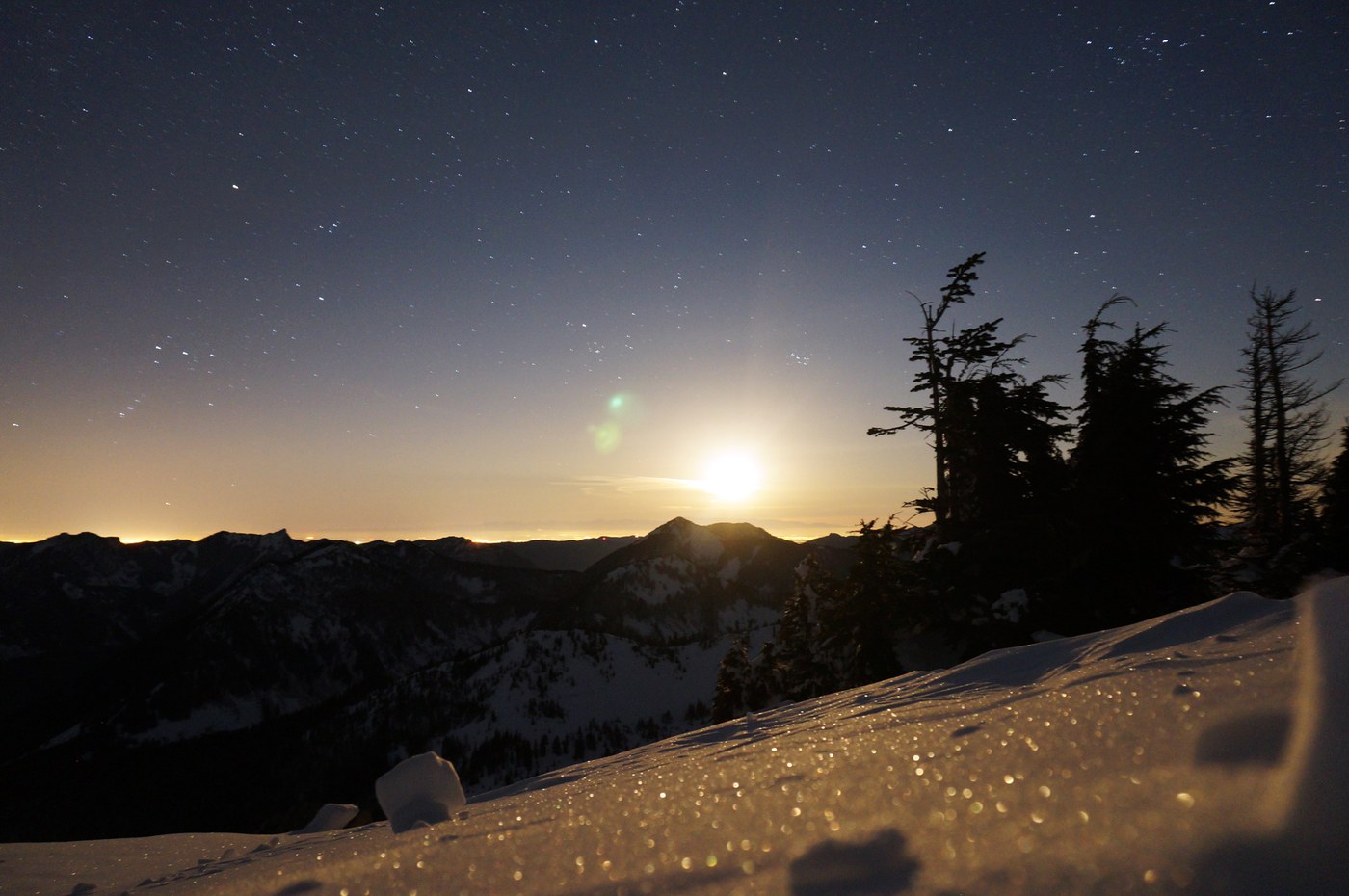 Once you reach the meadow, you will want snowshoes but a determined person can make it without them (not happily I will add). Once you reach the spine, there are parts that are rocky and hard to navigate with snowshoes and others that the snowshoes help a ton on. The snow is still only about 2ft deep and most of the old beargrass stems are poking through. If you decide to go along the summer route- there is a lot more snow there and not many tracks to follow.