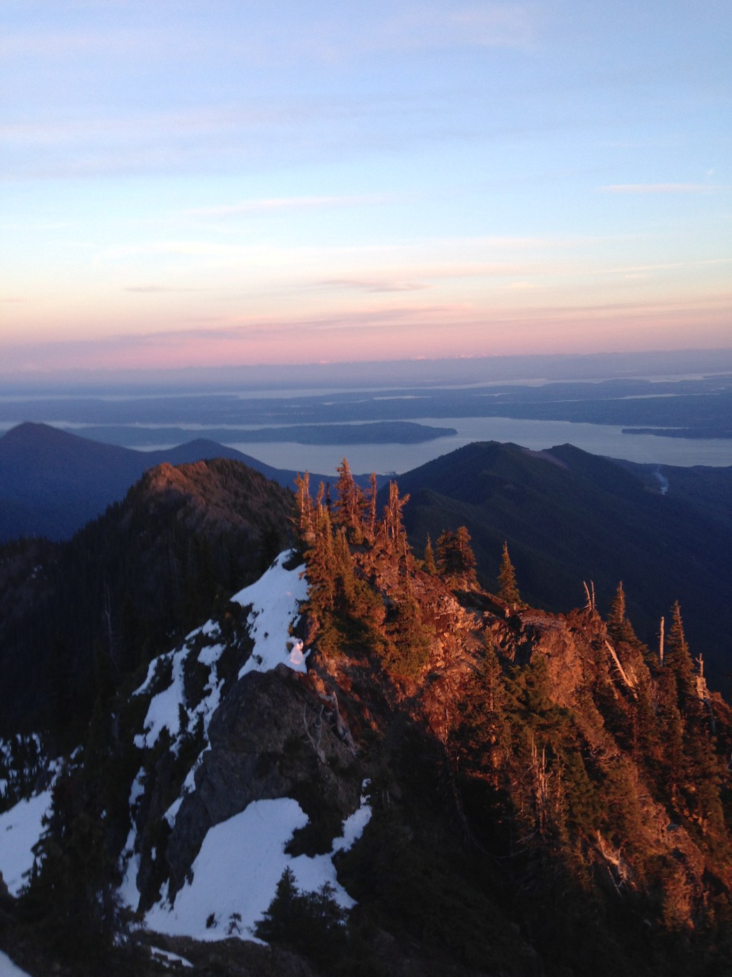 Got in a trail run up Mount Jupiter on a sunny Monday in January. Road is blocked 2.7-3.0 miles down from the trail head by an orange gate. The trail is to the right of the green Mount Jupiter trail head sign. It is not the most definitive trail and it's hard to distinguish it from a deer trail. The trail climbs through a clearing with trees that reach a few feet above the head of an average person. The views of the hood canal, Mount Rainer, and the Duckabush Delta are spectacular. There are many ping pong ball sized rocks that litter the trail and small branches. The trail passes through a grove of trees that was left between two sections of logging. After the grove, you reach another logged area with many downed trees and loose branches on the trail. There were loggers burning branches down below the clearing which was kind of startling because of the dryness of the area. This section of the trail lasts a mile and climbs approximately 600 feet. After the second clearing the trail enters into the forest and meanders up the ridge. It follows the ridge on the left (Duckabush side) switches over to the right (Dosewallip side) and back to the left. For three miles the trail is fairly flat gaining only 450 feet. There are many branches, downed trees, and Salal that is encroaching on the trail. The trail's steepness increases significantly after the 3500 feet sign. The gain each mile is about 750 feet and this continues for about three miles. There are many Rhododendrons and fir trees that need to be pushed a side or waded through towards the top. If there is trail work to be done in the future the majority of the work would involve pruning and cutting these obstacles. The trail becomes increasingly rocky as the top gets closer and was very enjoyable to maneuver through. There is minimal snow towards the top considering it's January. The views from the top are some of the most wondrous I've seen. Facing towards the canal you can see Mount Baker, Rainer, Cascades, and the bustling metropolis of Seattle. Facing towards the Olympics the Brothers stand tall to the left and Mount Constance sits on its rocky throne to the right. I stayed at the top until the sun was obscured by the brothers and hiked down as the sun shining through the atmosphere turn the rocks and the trees into a glowing red. On the way down I saw a peculiar Grouse that was very dark feathered. On the way down, there are a few uphills on the flatter section of the ridge that are a little difficult after travelling to the top. The total elevation gain was around 5300 feet and the total distance out and back from the orange gate was about 20 miles. The views of the hike are definitely worth in if your willing to go the distance and elevation on a trail the needs a some work and love.