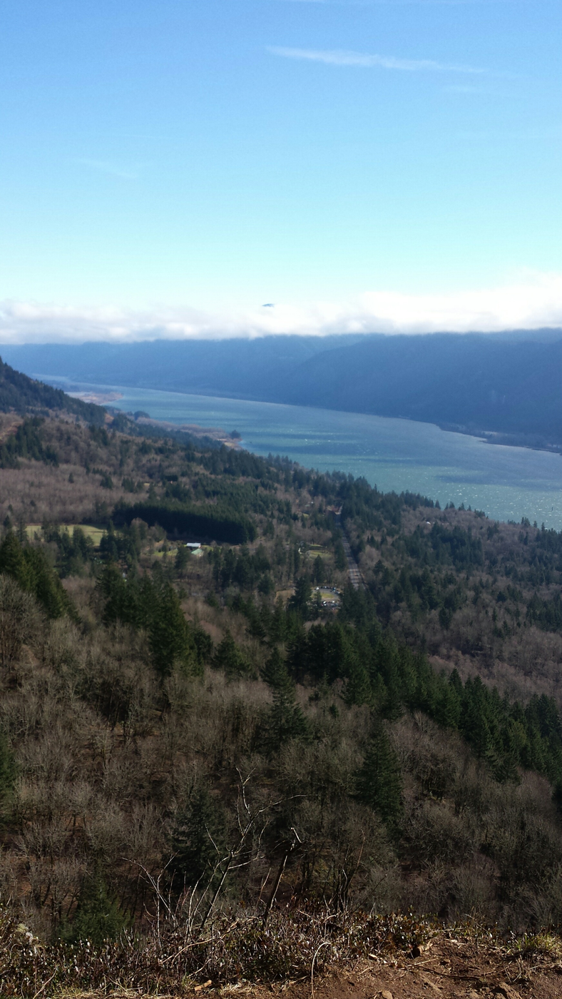 The loop trail is bisected by the highway. We took the loop counter=clockwise with the first half of the hike "above" the highway. Enjoyable views and wide portions of trail in the upper half. After crossing through a pedestrian tunnel under the highway, we began the lower portion of the trail. The route became much more sketchy, narrow, and rocky, but most enjoyable for the nearness to the Columbia and the waterfall. In retrospect, we wished we'd taken our lunch break before we hit the lower trail though, as its narrowness and exposure to extreme winds precluded a leisurely stop.