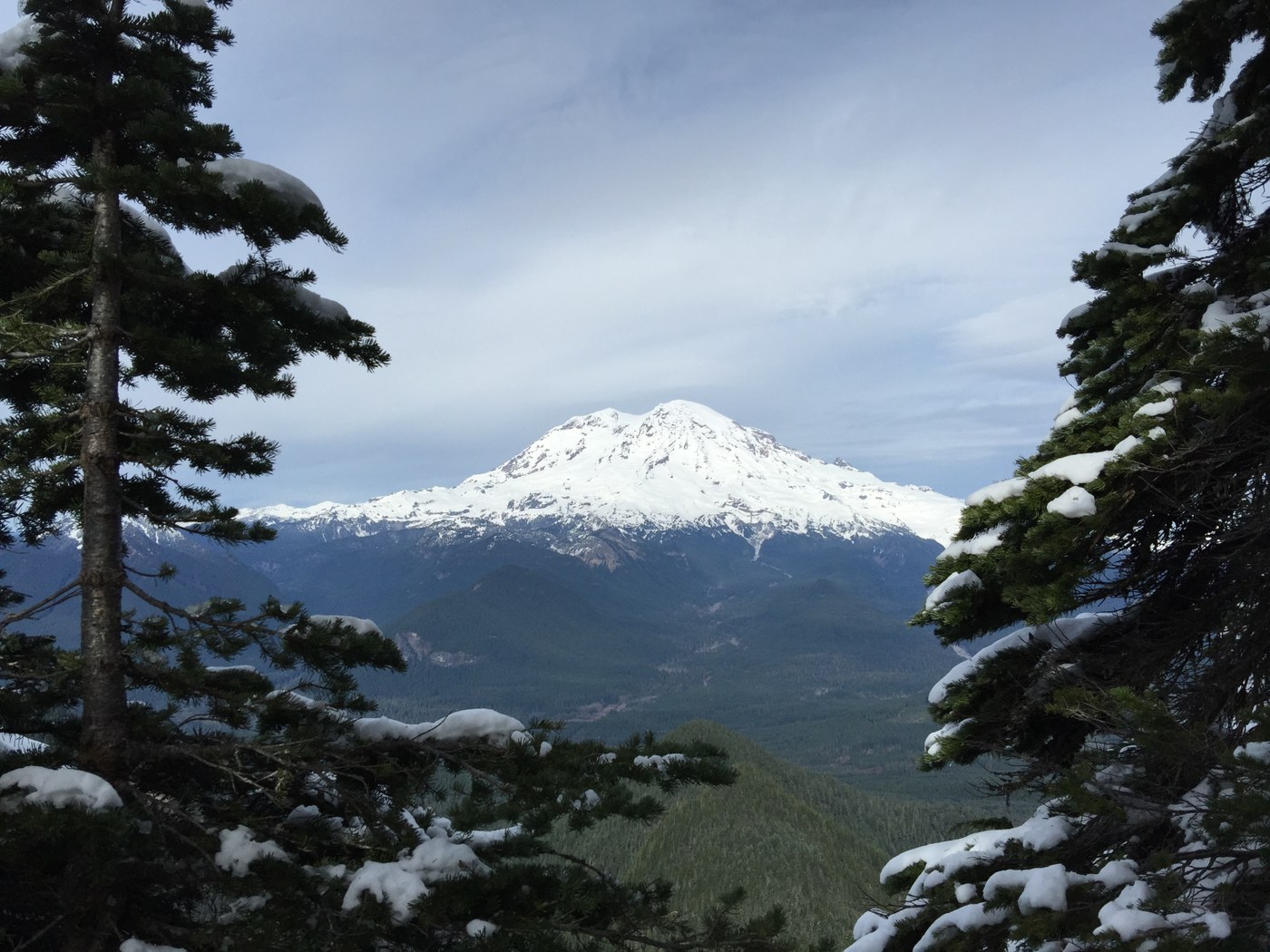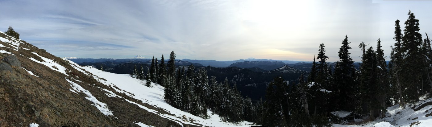 Nearly 3/4 of the way up the trail you break out to a ledge that has a partially obstructed view of Mt. Rainier and an excellent view of Mt. Adams. This ledge was pretty much snow free. After taking a short break I continued up. The rest of the path from here up was completely snow covered and icy in many places. A pair of microcrampons would have been nice to have since I did a lot of sliding. More on the way down than up. Once reaching the ledge that the lookout is on the snow is melting away. The view was breath taking. I was able to see Mt. Rainier, Mt. Adams, Mt. St Helens, and Mt. Hood.