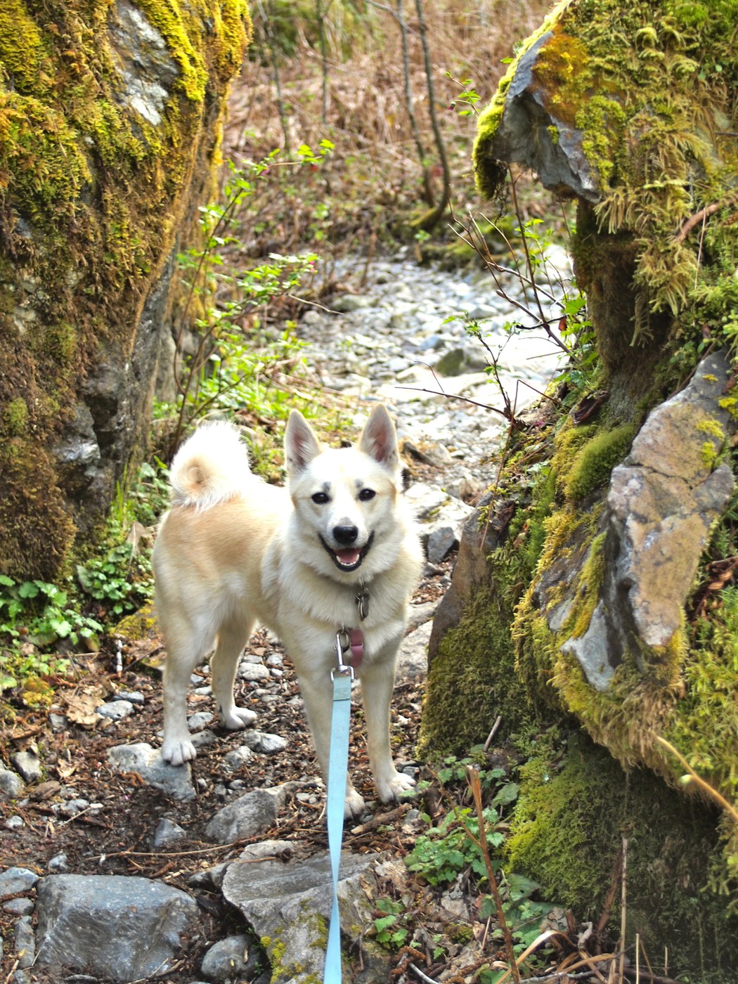 Lakka and I took a little hike up to Trout Lake on the way home from Leavenworth. The road to the trailhead was good, and the trail was in excellent condition. Lakka crossed the beautiful new bridge with a little trepidation (high up and fast water under, for a dog relatively new to hiking) then was busy sniffing for signs of small mammals along the trail and eating the 1/2" dusting of fresh snow along the trail. She waded the chilly stream crossing quickly while Mommy stepped carefully across in her waterproof boots. A good trail for leashed dogs--wide and level enough for human companion to walk comfortably, leash in hand, without tripping up when looking up!
