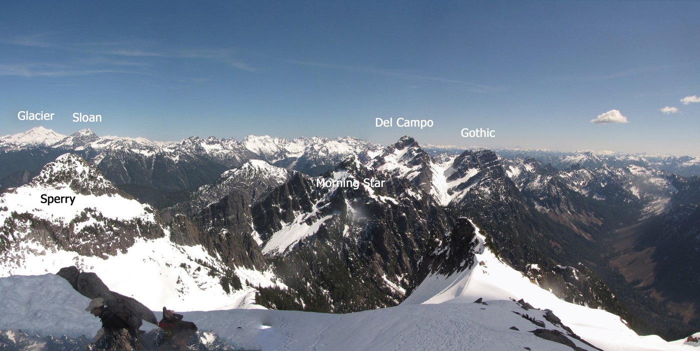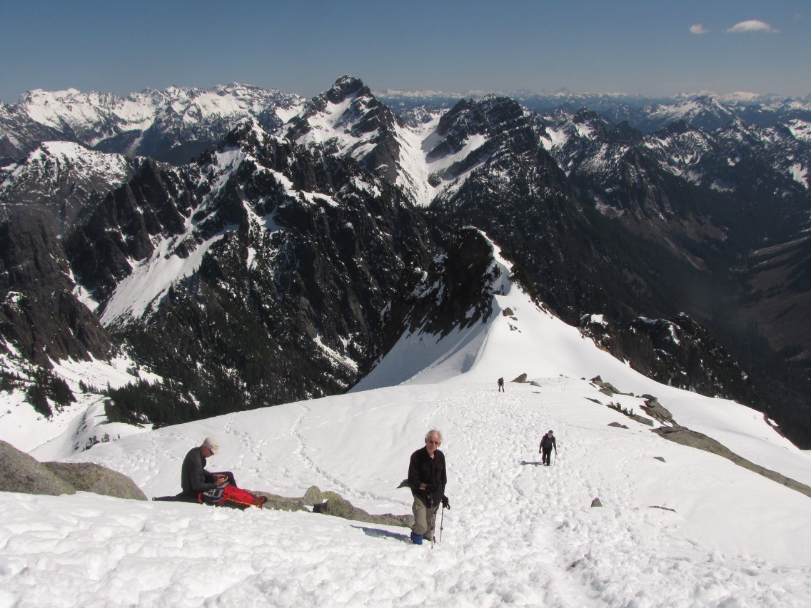 From the pass at 4600’ it’s essentially a long steep trek up another 1500’ to the summit, made especially tiring yesterday by the deep soft snow. The summit is worth all the effort, with spectacular 360-degree views, including Three Fingers, Whitehorse, Baker, White Chuck, Pugh, Glacier, Sloan, Morning Star, Del Campo, Sperry, Stuart, Rainier and on and on.
