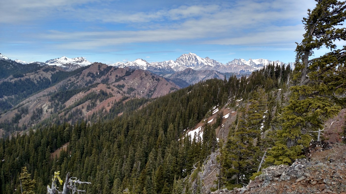 Made the long trek up the ridge over Yellow Hill and onto Elbow Peak. The snow didn't start until just before Yellow Hill, which must have been about 5200' of elevation, and was intermittent and passable. The ridge between the two peaks was clear of snow, as in the photo. The summit of Elbow was almost clear -- plenty of rocks to sit on. This hike has great views, but it's a long walk with lots of altitude gain, given back, and regained.