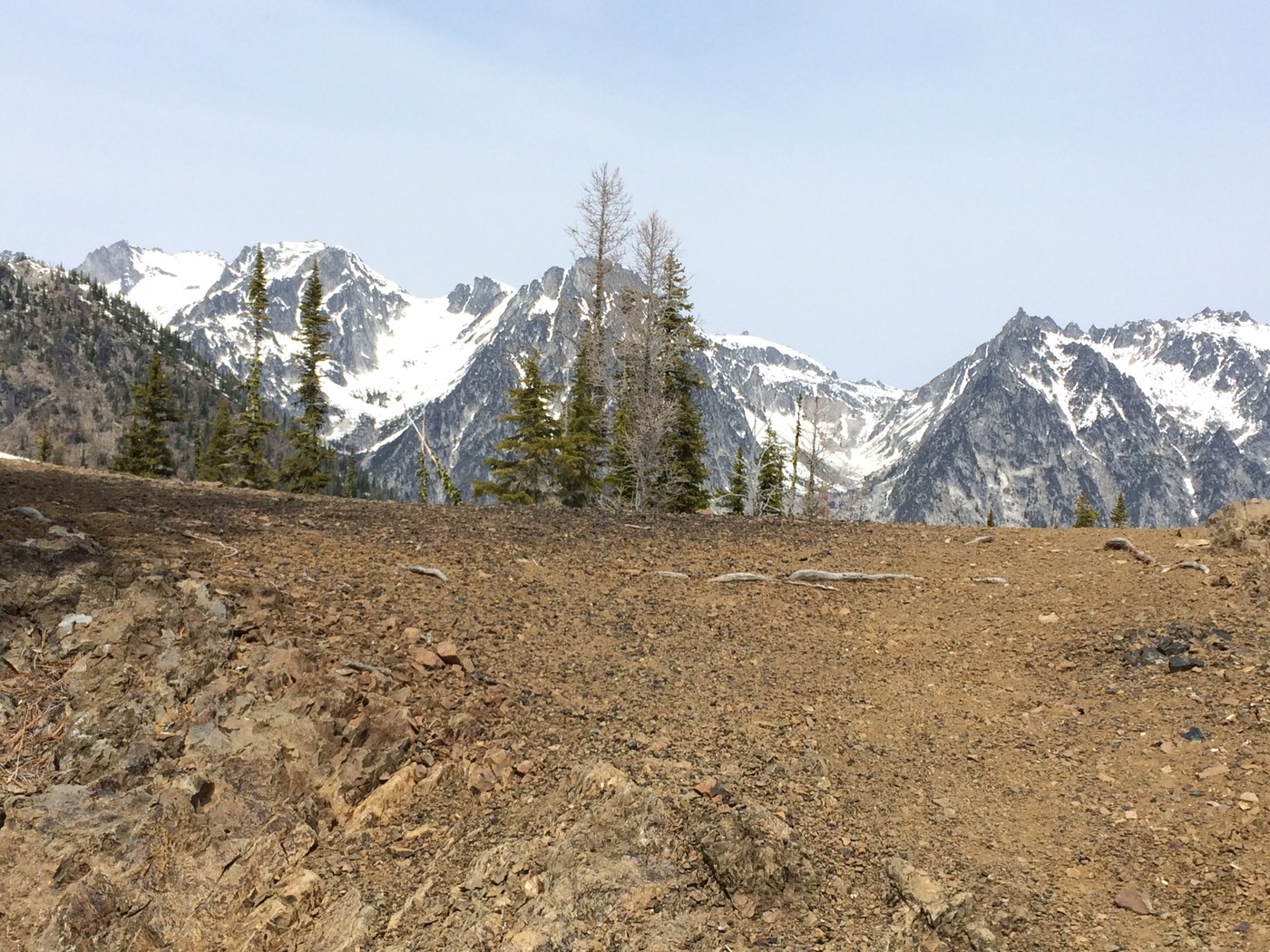 The views of the Stuart Range are great from here but you have to head towards Navaho Peak to see Mt Stuart proper. Follow the County Line trail for about .3 miles and then veer upwards following the ridge. The "trail" does appear periodically and the snow is spring-like. The trail does go parabolic for a ways but that area is now mostly loose dirt and a few occasional snow patches. Then there is a bunch of snow to near the summit but the summit block is snow free.