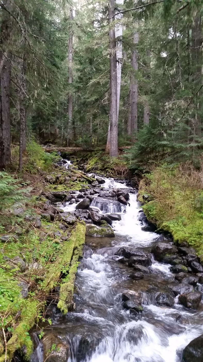 Very little snow on trail, some mud, water and logs down.
