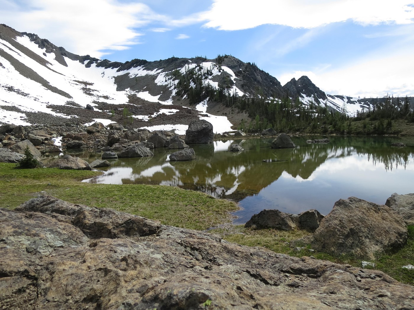 The trail was completely snow free until we got to the Lake Ann lookout. From there down to the lake there are still a few small snowfields to cross. While the amount of snow looked negligible, it turns out that the steep hillside under them is actually pretty treacherous right now, as the scree slope they sit on is supersaturated with snowmelt. As I stepped to the edge of the second small snowfield, the ground beneath it suddenly liquified, and I had the strong sense that while an avalanche was unlikely, a mudslide was quite probable, and it was a scary moment. We backtracked maybe 50 yards and opted to scramble down a snow-free patch through the trees instead, and while this way is steep and there is a lot of loose scree, it was far more solid than the actual trail at this point. I imagine that with just a few more sunny days, though, the snow will be completely gone from the trail. Once we got down to the lake we enjoyed our lunch and the squeal of marmots.