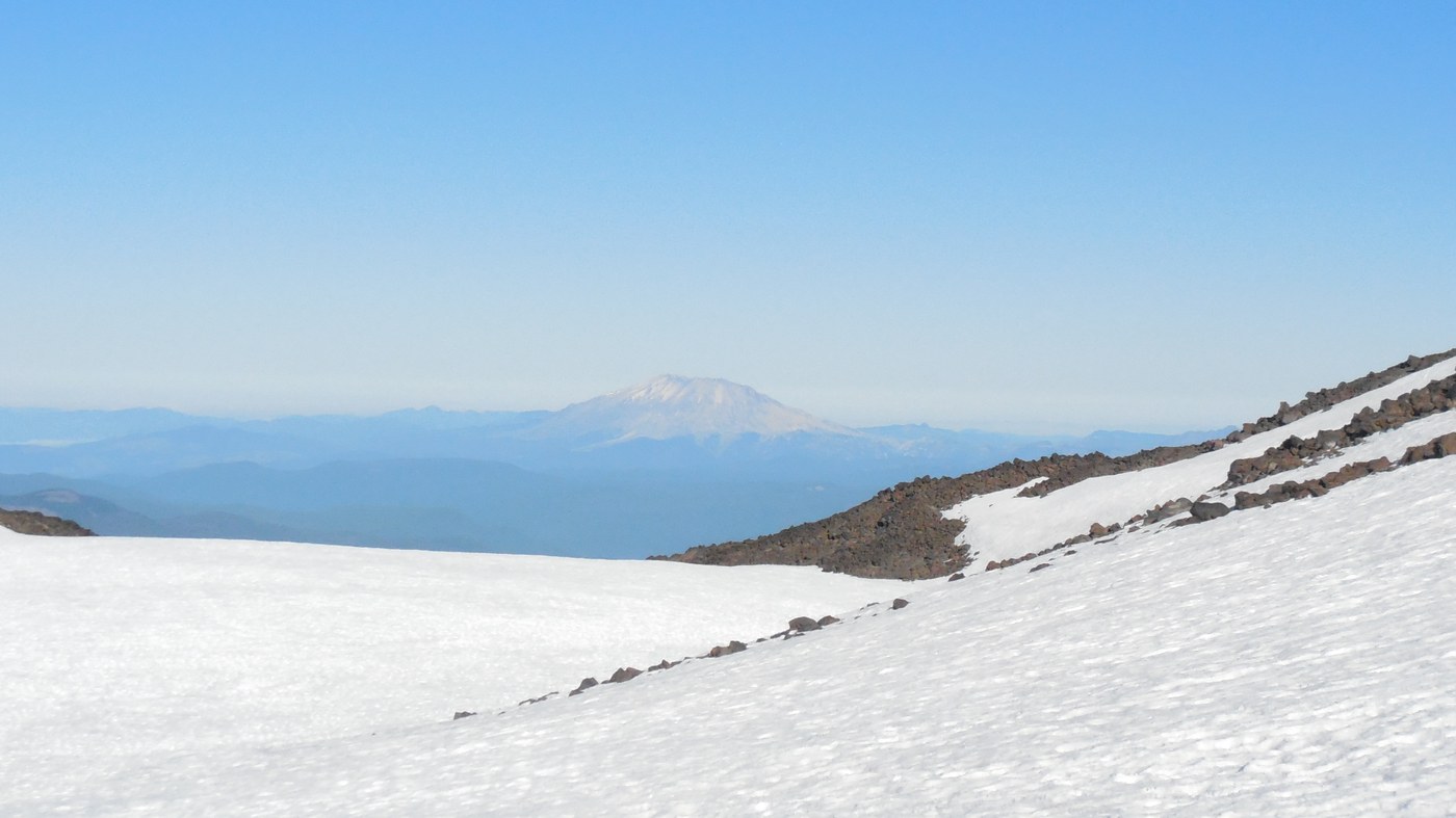We left the summit at about 12:15 and the snow was starting to soften. The skiers and boarders seemed to have good conditions and were enjoying themselves, and we decided to test out the glissade chutes. Note that they are running quite fast - we donned helmets, removed our crampons, and of course had our axes to regulate speed, but we were still really moving on a couple of them. We had one continuous glissade from Pikers that must have been nearly 1,000 feet. It's always alot of fun going down so quickly while watching people slowly go up the mountain, pausing to watch you slide past. There are a lot of warnings about glissading on Adams and they are well-stated. We encountered another climber who hurt his knee pretty badly, and I made the mistake of being too lazy to put gaiters on got some pretty nasty ice scrapes on the calves. Coming down we saw a lot of groups coming up to camp at Lunch Counter. Some more snow definitely melted yesterday, so the snow line rose a bit for our trip out, and we made it back to the parking lot in just over 3 1/2 hours (3:55 pm).