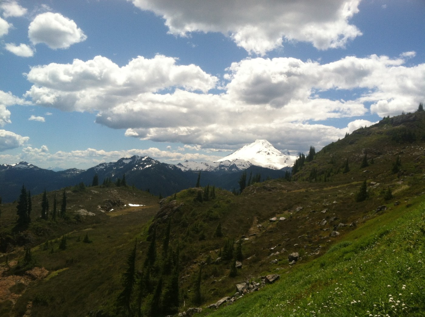 Started at 11:45 and made it to the top at 2:15. There were a few downed trees crossing the trail but nothing too difficult to get around. After about two miles there was a small snow field but you could cross it in tennis shoes it was that easy. Also, there was a stream right before the snow field to fill up water. A fantastic hike!