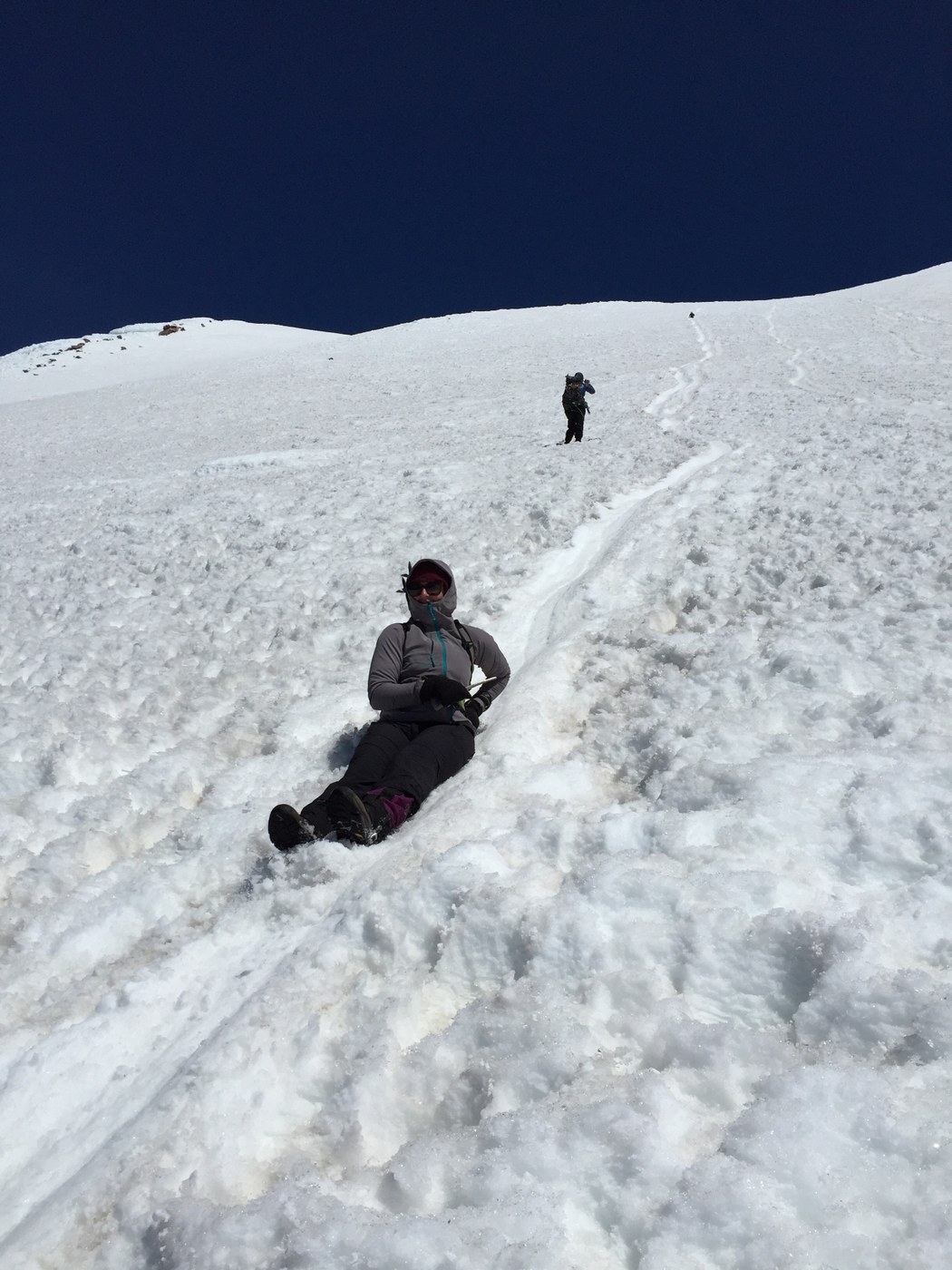 It was icy on the way up but the snow started softening as we made our way back down. This helped with glissading and the shoots were awesome. We were able to glissade almost the entire way which made the descent much easier. We stopped halfway for lunch and to shed some layers as it was getting much warmer and sunnier. We made it back to camp, packed up and headed to the car.