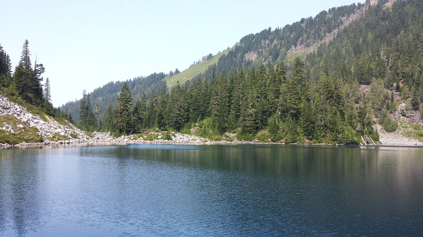 Today we hiked to Boulder Lake off the Suiattle River Road. The trail begins at the end of Tenas Creek Road (road 2660), seven miles after you turn off the Suiattle Road. The road is in good shape with a few rough spots but ok for most any vehicle. The first half mile or so is brushy but don't let that discourage you. The rest of the trail is pretty good though steep in places. The trail mostly follows Tenas Creek all the way to the lake. The trail is in the timber for about the first two miles then it breaks out into steep open meadows with wild flowers and boulder fields. At the head end of the canyon you will see the outflow from Boulder Lake cascading down the steep rocks. The trail crosses the creek and goes up a rocky slope to the right of the outflow. The lake is at the top of the rocky slope. I would guess it was about 3.5 miles from the trail head to the lake. It took us 2 hours up and 1 hour 40 min down. The lake was pristine and the surrounding mountains views were outstanding. We caught a few fish and went for a swim. Quite refreshing. We only saw three other people. I don't think this is a very popular hike though I'm not sure why. We loved it. Next time we might try to continue on for hurricane peak. There were no mosquitoes but the flies were annoying. I would recommend this hike especially if you like less populated hikes.