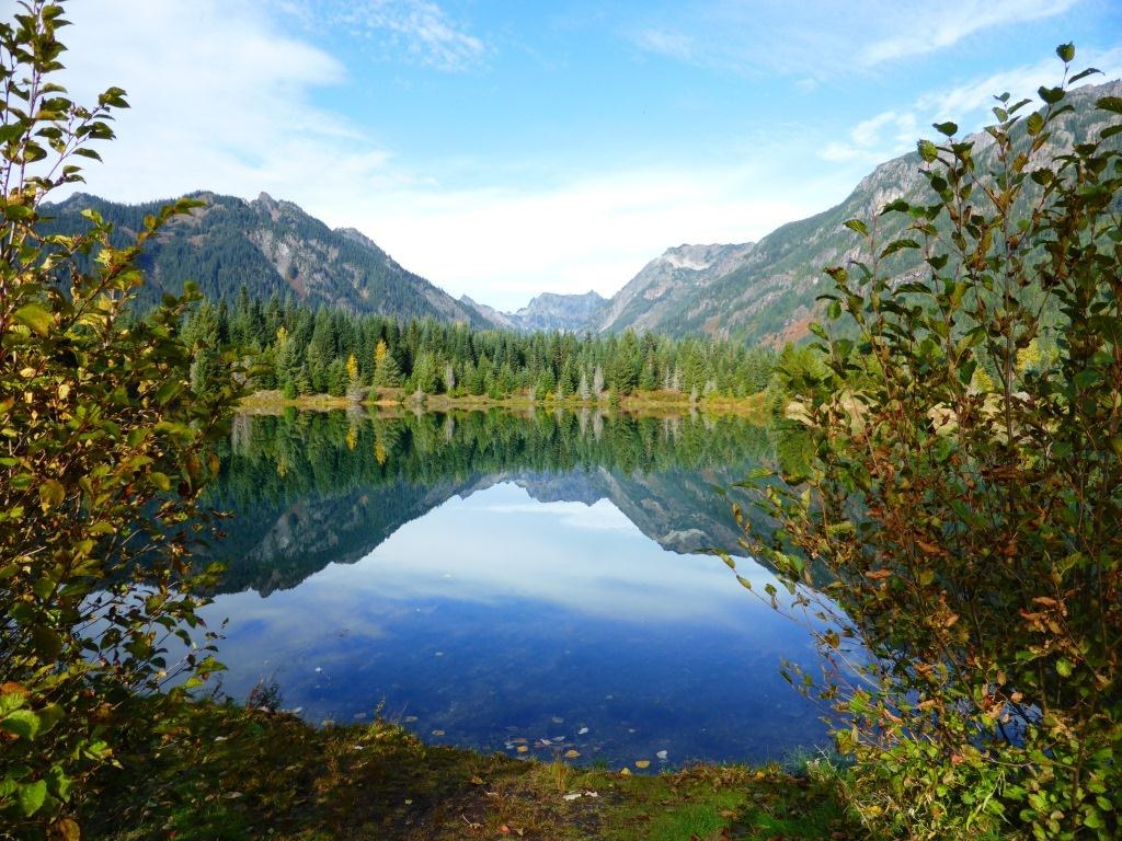 This short loop hike can entertain for an entire afternoon or provide a quick fix of nature and a nice picnic spot. The salmon are running NOW (October 11) (I assume they are Kokanee, but if someone knows different please say so). There are no signs suggesting that you look for them, but good views of the flashing and leaping red backs can be found from the bridge between the parking lot and the lake and in the channel that runs parallel to the trail before you get to the turnoff for the Gold Creek Trail. We were distressed to find a family methodically destroying a beaver dam in the channel; they thought this would help the salmon get up the channel to the lake. We asked them to stop because salmon spawn in the channel not the lake and the sudden release of water and sediment behind the dam could wash away and/or cover the eggs that were being laid just 20 feet downstream. Our pleas were in vain, as we came back later to find a channel through the dam.