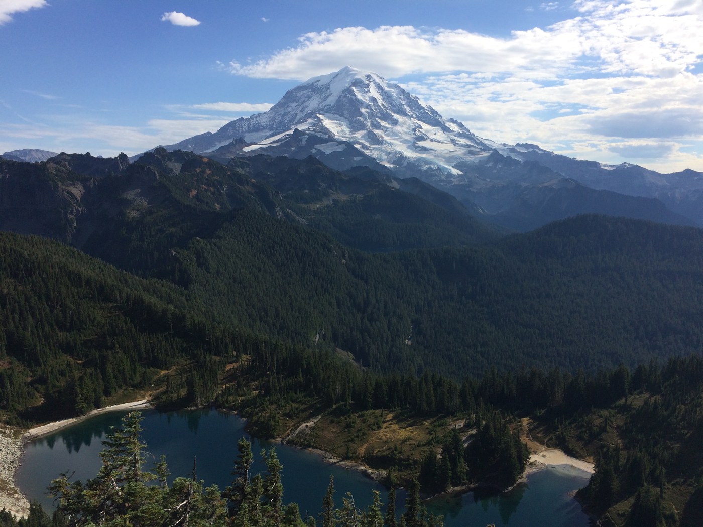 It was a beautiful day for a hike. To start, the road about 11 miles from the Mowich Lake Campground parking lot was unpaved, rough and filled with pot holes but wasn't too bad as it wasn't very busy. We arrived at Mowich lake at about 11:30am to start our hike. the weather was perfect and the trail was well maintained. We didn't see too many hikers along the way, which made it feel nice and secluded. There are two lakes that you will come across. The first is Mowich lake which starts near the parking lot, and the next is Lake Eunice. Both are absolutely breathtaking! The water is a beautiful turquoise blue with a rocky backdrop, which includes the top of Rainier peaking from behind. The majority of the hike takes you through tall evergreens and rocky cliff faces until you reach Eunice Lake. Once we reached Eunice Lake the hike from the top was about a mile, a steep mile at that, but it went by quickly, especially considering how far away it looks from the lake.