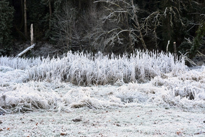 It was a pleasant walk in the woods. The hiker who passed us was no where within sight or sound distance. It was like we were all alone on the trail, hidden among the quiet of the trees and frost all around. It was a serene feeling and a very relaxing place to walk. Just what we were looking for.