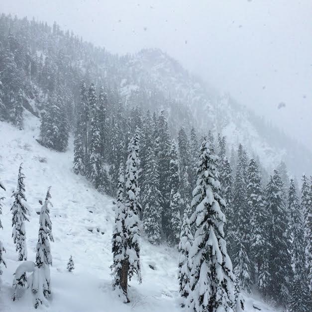 There are a number of log bridges to cross. Be careful to stay in the middle of these crossings and in the middle of the trail. One friend postholed up to his hip and needed help digging out. The trail ascends gradually at first and then at approximately 3.5 miles, the trail begins to ascend steeply. Our thighs were working overtime! We did not actually make it all the way to the lake. We were probably less than 1/2 a mile away according to our GPS, but the snow starting falling fast, creating white out conditions. We were all feeling hungry and tired so decided to break for lunch and head back to the car just in case conditions worsened. We slid down on our butts a good portion of the steep section just for fun, so bring rain or snow pants!