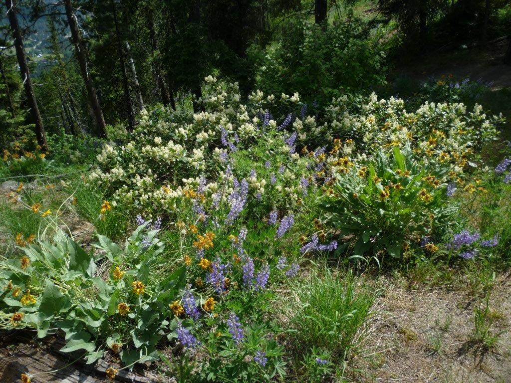 Once we got to the east end of the trail, we could see down into Leavenworth and the valleys and hills beyond. There is an almost 360 degrees view of the entire area. There was a thicket of blossoming snowbrush (Ceanothus) at the end of the trail – probably protecting us from seeing the sheer dropoff beyond. On the way back, we saw additional wildflower species that we had missed on the way up – there are just so many varieties !