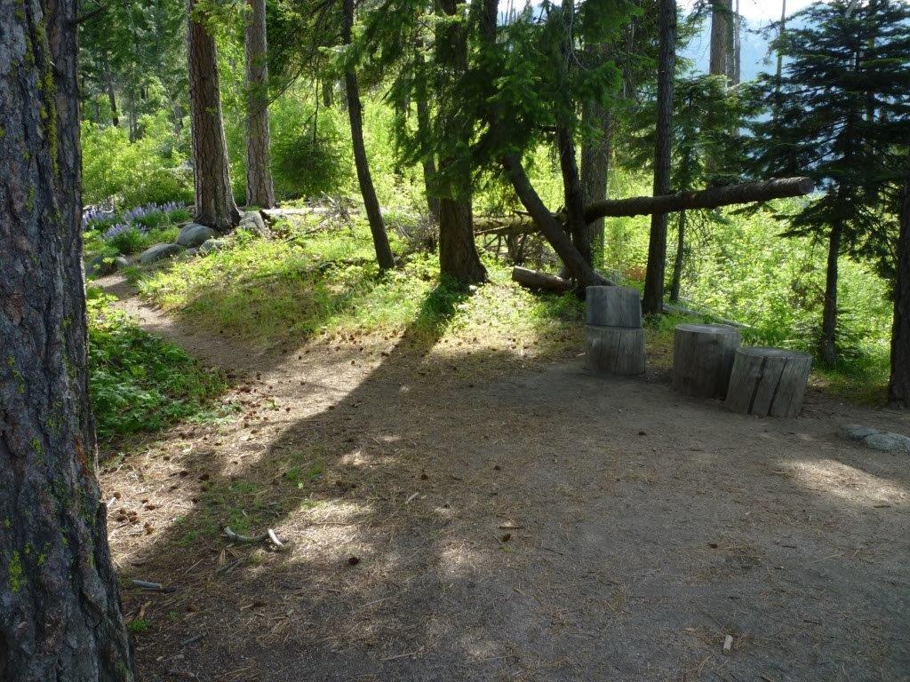 The trail is well laid out, a dirt trail with occasional rocks or roots and a steady approx. 10% grade all the way up. The trail was very dry when we were there. Caution was still needed, as the trail traverses a steep slope. At one switchback where the dirt was more gritty, we skidded a little going down. When you can first see the ridgeline above you, you are about halfway. When you get to the top (saddle), you can recognize the saddle from the 3 tree stumps that provide a nice resting and lunchplace. To conclude the day hike, turn right at the saddle and follow the trail for a couple of hundred yards up and down a little bit, until what appears to be the end of the trail, a small clearing with a couple of horizontal logs where you can see Leavenworth lying beneath your feet. However beautiful it already is at the saddle, it is definitely worth the few minutes extra to go to the right, because of the additional views and wildflowers.