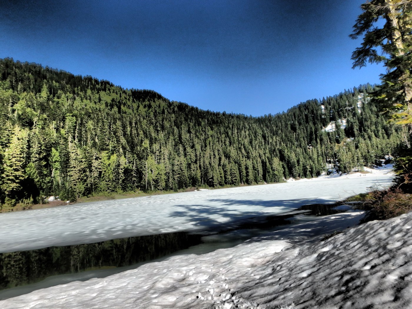 The road is muddy on the way there but it wasn't too bad. Most of the trail is pretty grown in easy to find but in a month or two it'll be really grown in. The flats before the lake and all around the lake covered in deep snow but was easy to walk on. Lake was about three-quarters Frozen mostly slush one good-sized Camp site with no snow.
