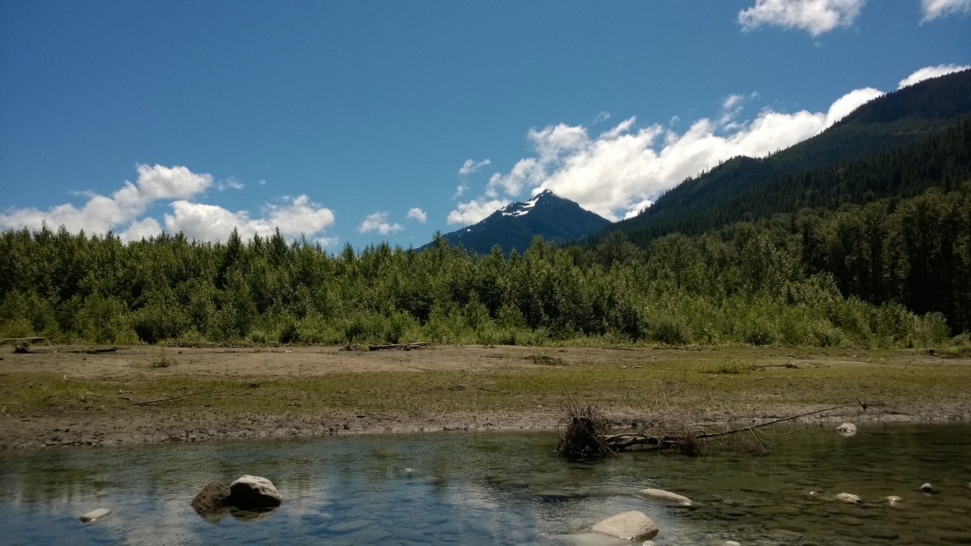 On we wandered and to our delight when we reached the lake and the bridge there was a parade of hundreds, nay, thousands of tadpoles is a continuous procession slowly floating around in endless loops. More unknown birds sang from above and fortunately even though it is a marshy area - no mosquitos. We continued on to the end where the river - no doubt in the awesome 2006 floods - had washed out the bank. We found a way down to a perfectly placed lunch log along the remaining river braid. Suddenly we were greated by the largest Monarch butterfly I have ever seen who seemed very interested in our bright colored clothing. We also saw terns feeding along the sandy bank of the sand bar that lay across the shallow water. And indeed we took our boots off and had an explore on the opposite sandy banks. Intrepid hikers will continue on and find where the trail continues up to the left and appears to offer a loop back along an old road to the trailhead. Study the map at the trailhead carefully for your path. But we were content to sit and watch the clouds slowly unveil the higher, snowy reaches of Mt. Pugh, Mt. Forgotten, and further south, the snowy north flanks of Bedal Peak.