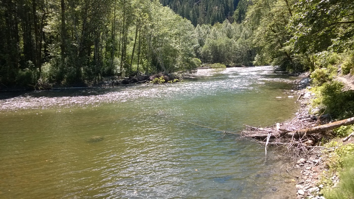 It had rained hard the day before so the trail was fairly muddy but not too bad. Salmon berries edged the trail the whole way but hikers should be mindful of the stinging nettles nearby as they reach for those hard to get berries. The trail description describes the washed out river section but that has been mostly repaired. Unsure hikers should bring along their hiking poles for stability here. And even though it was somewhat muddy, we had no problems. Considering other possible trail obstacles, its nothing really. The advantage of this section is that the river is wide open to view. On the far bank we saw what might have been a merganser in a sheltered area near a log. As it took flight upriver we noticed a flash of red and saw that a woodpecker was catching bugs high above.