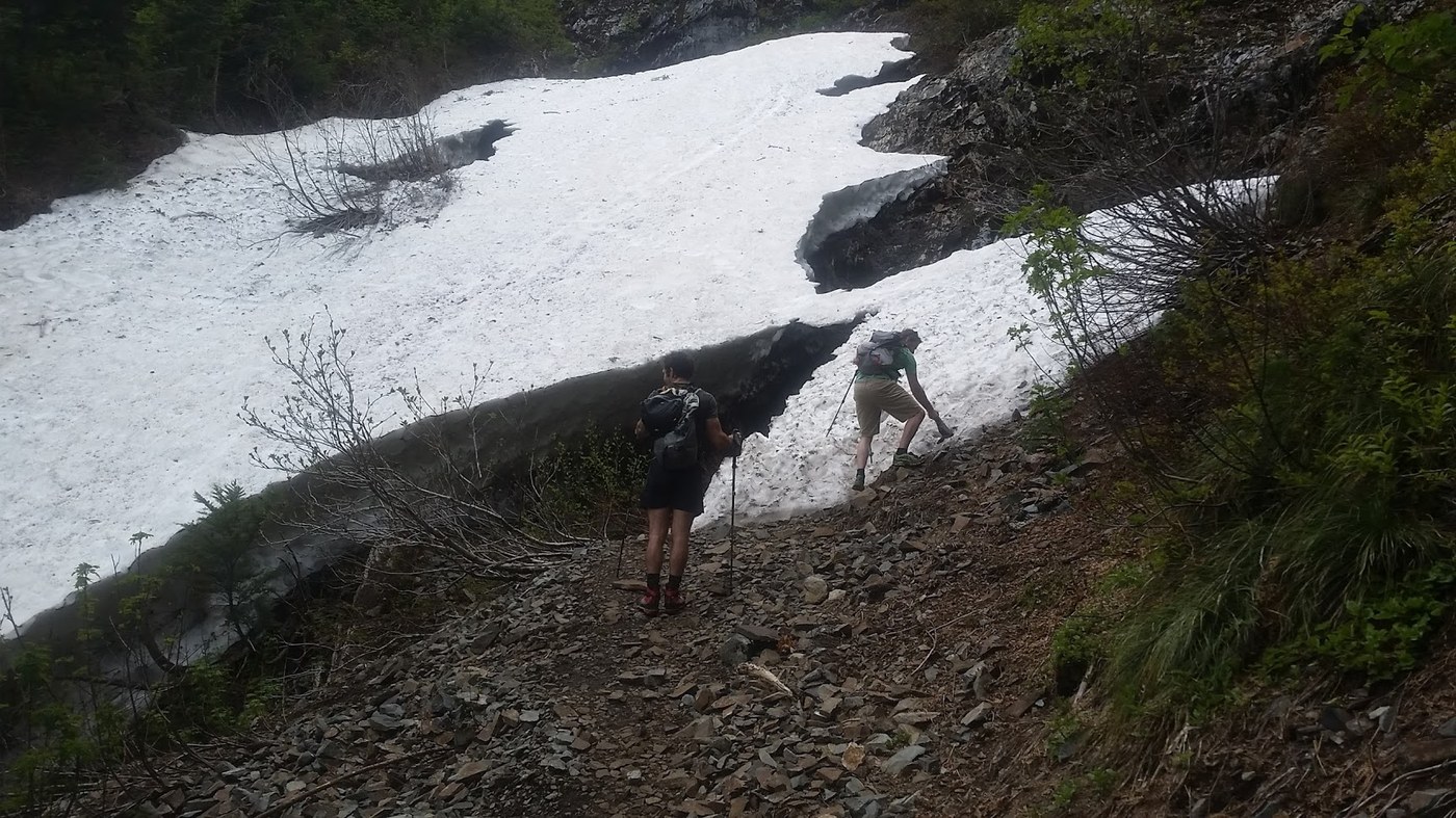 Headed out on Monday afternoon to get a few hours I-90 training exercise. At the Tinkham road trailhead the forest service was cutting down some trees and the trailhead was closed. After waiting for about half an hour we drove one exit west on I-90 to exit 38 and headed up Forest road 9020 to the "upper" trailhead (see GPS). The trail is in good condition and the two avalance chutes are manageable with a bit of scrambling, at the second chute some nice person has a left a rope to aid with climbing out of the ravine. This was my first time on the trail and the views really start to pay out early, the Duke and Duchess of Kent are beautiful as you traverse around the back side of McClellan and reach the top. On the back side approach around 5000' there is still quite a bit more snow than we expected, but it was not necessary to use microspikes. The rock climber in our group climbed all the way to the top of the butte, but the rest of us were chicken and only went partway up. This hike is truly fantastic, and it is interesting to be able to get the southward view from the I-90 mountains.