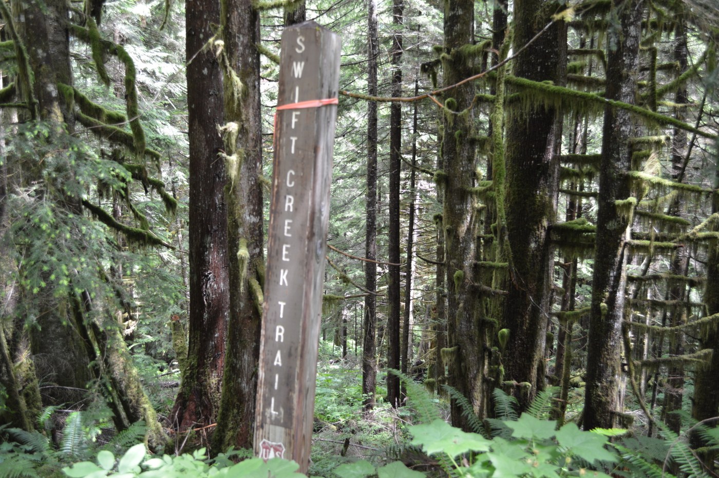 Swift Creek trail is beautiful and well-enough maintained at least up until the first ford. There is man-placed tree and cable to guide over the Swift Creek. You could clip in to a harness to be safe but the tree is pretty wide and we walked it with a dog. Afterward we found the trail difficult to locate but did locate it:
