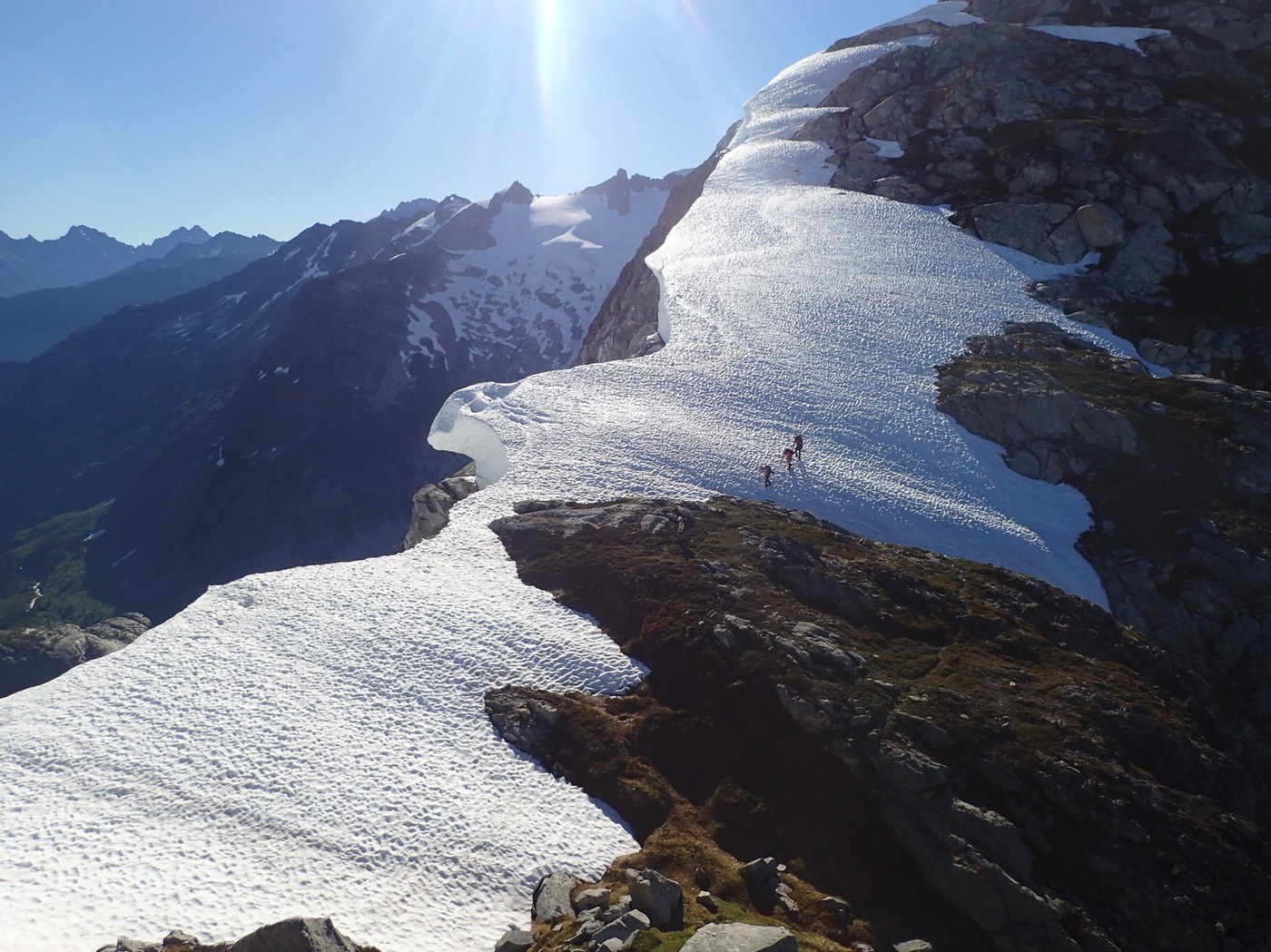 Headed up Torment Creek (note, not the standard approach!), then followed the ridge line above Moraine Lake to the west. Camped near Point 7252. In the morning, headed out at 7 AM following the ridge west. Got on the Inspiration Glacier near Point 7292. Very few crevasses. Some of us summited the Eggplant (Point 7733). Dropped some gear and joined the standard ascent route. Summited at 1 PM. Knife Edge was not very edgy. Took the standard route down Eldorado Creek back to the trailhead.
