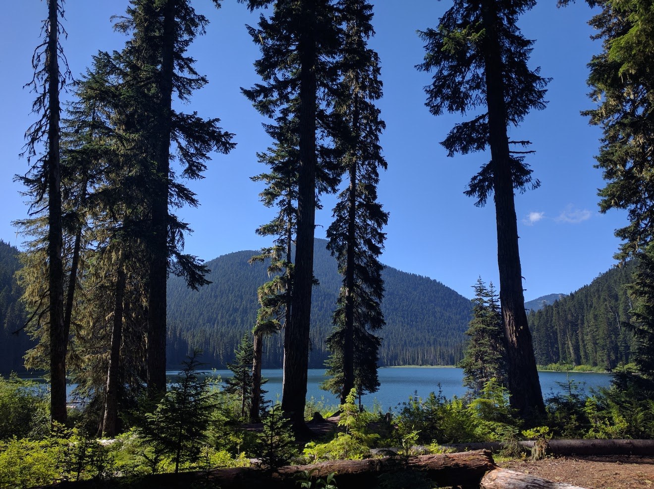 The trail is lush with ferns, moss and stately trees. The beautifully built bridges criss-crossing the gushing Greenwater River add interest to an otherwise fairly standard river hike. Early on there's a bridge marked closed and teetering sideways at a somewhat disconcerting angle; it's still usable with some care. The second half of the trail has some blowdowns to get around, but aside from that, the trail is in great condition. Having left the parking lot at 3pm, we arrived at Echo Lake around 5:45pm. Despite it being a peak summer weekend, we still found a lovely established campsite just past the south end of the lake to set up for the night. The bugs descended almost immediately but were manageable with bug spray. The lake is at a low enough elevation to allow campfires, which also helped with the bugs. All in all, a nice low-key overnighter, and only 90 minutes from Seattle!