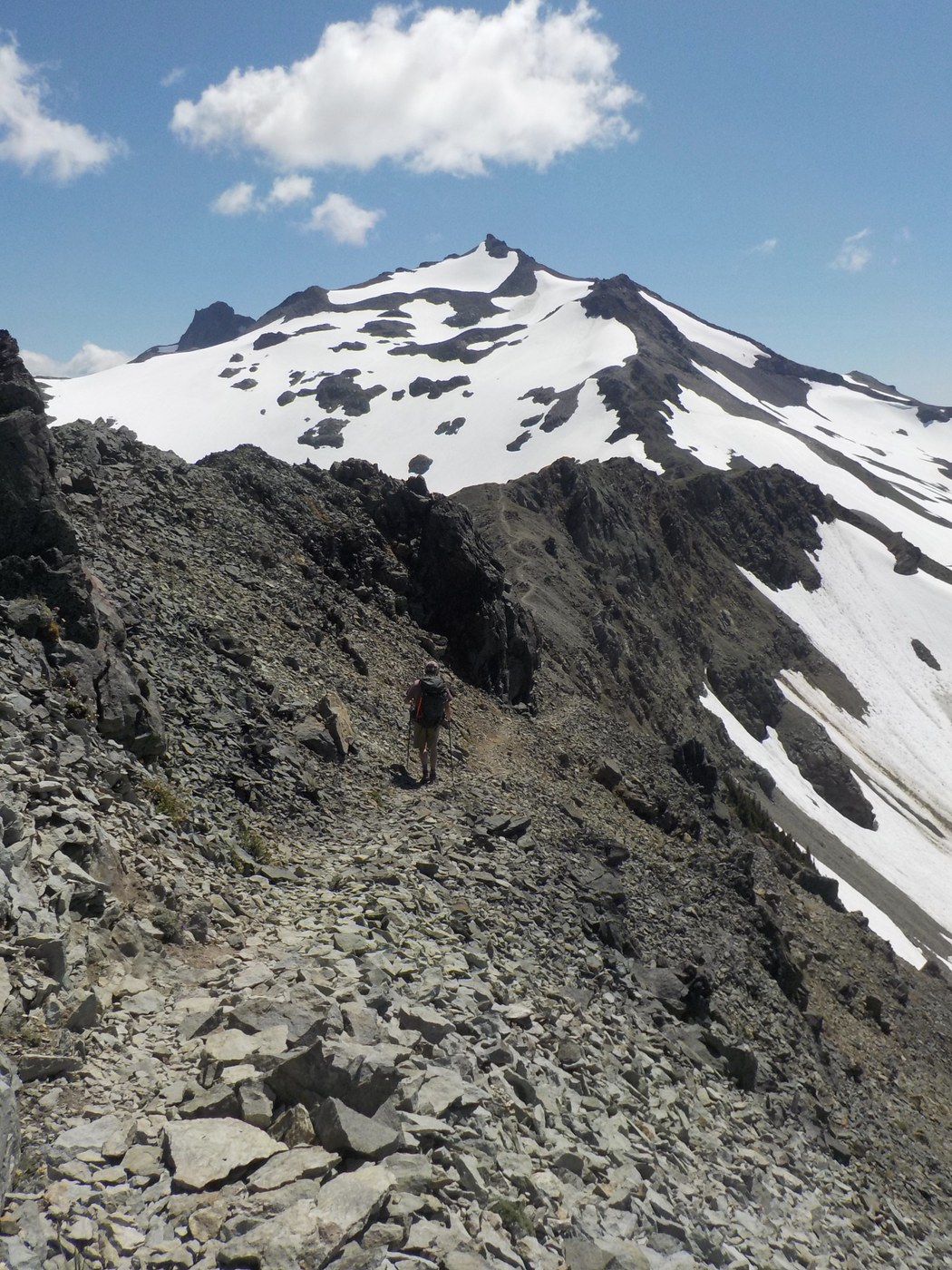 The goal was McCall Basin for a 2 night basecamp with a day hike south on the PCT from Tieton Pass to Old Snowy. Besides some rain on the hike in (isn't the first week in August supposed to be the surest bet for fine weather in the PNW?), accessing the trail (#1118) to Tieton Pass was complicated by the fact that the road (NF 1207) to the trailhead at Scatter Creek Campground is closed due to a washout 3 miles before Scatter Creek. Road walking is easy but boring and it threw our timing off, resulting in a dusk arrival at the McCall Basin campsites. (It also proved to be a hot, dusty, sunny anticlimax on the hike out). Trail #1118 itself was in good condition except for a few small stream crossings mucked up by stock animals.If it were wetter, that would have been problematic.There were signs of recent sawing of large blow downs.(Thanks WTA?) The weather cleared overnight and the Basin lived up to it's billing from one of my hiking partners. Beautiful. The next day, the southbound PCT was in great condition. We met northbound through hikers already closing in on the Canada border. The ridge trail towards Old Snowy had some small snow patches but they were comfortably crossed with boots and poles (no microspikes needed). Views in all directions were perfect and the wildflowers (lupines, heather and Indian paintbrush for the most part) were in full bloom in the higher elevations. Back in McCall Basin the new-moon dark sky was impressive. One lingering question from the Basin: There was what appeared to be a large stock camp in one of the prime camp sites. No one was around the entire time we were there. Is this a long-term basecamp? A commercial camp in anticipation of elk season? Not sure what to think, but I wonder in view of the budget cuts and corresponding lack of any ranger presence. All in all,a great hike for three 60 somethings.