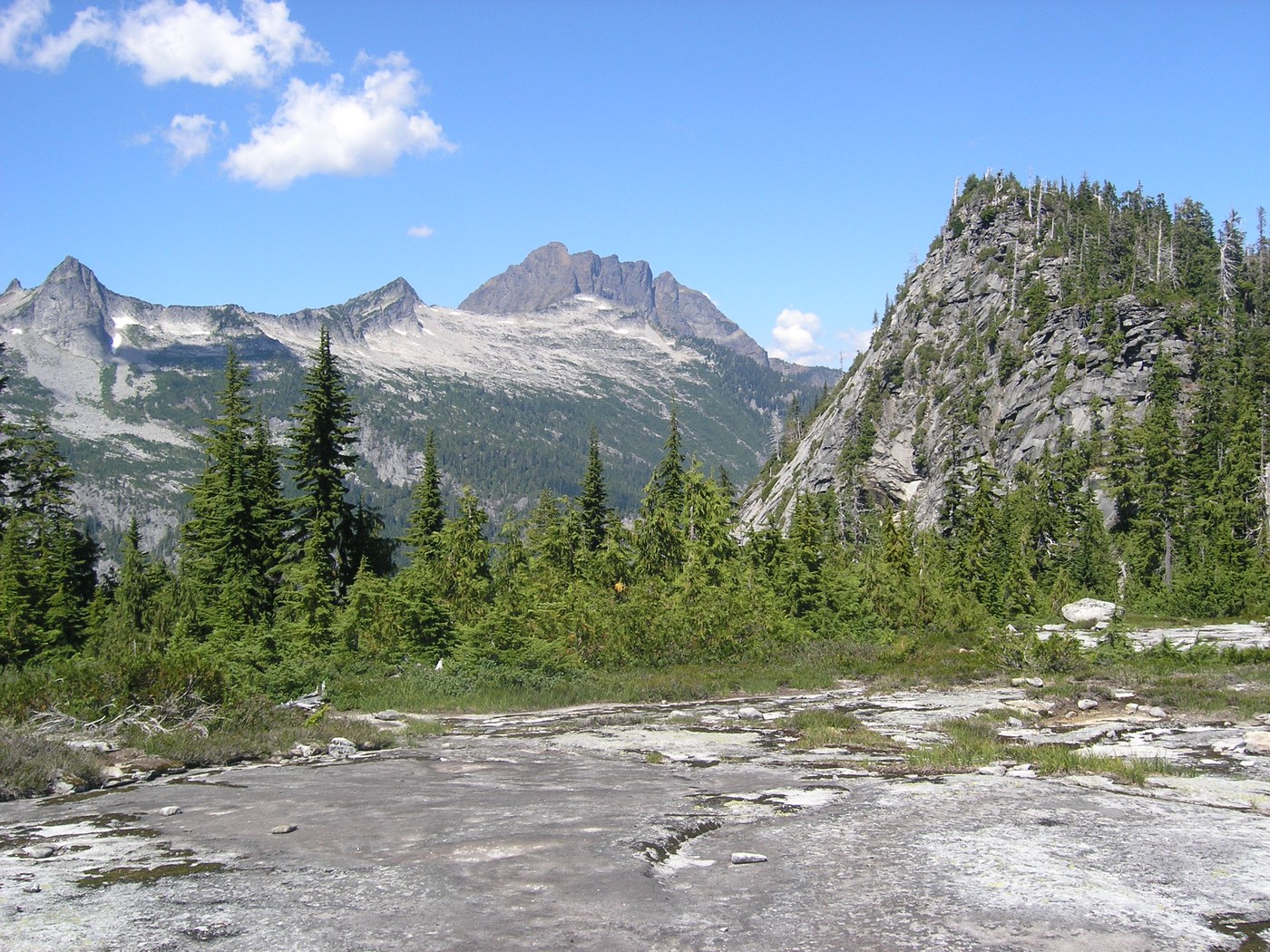 I did this trip a couple of years ago and was very impressed with wonderful, fairyland pools and waterslides that occur one after the other in the meadow section. These are pretty much dried up now, and I'd definitely recommend doing this trip in July since in my opinion this is the best feature of the hike. Still, the views from the pass are wonderful. Three Fingers is right in your face as is White Horse and all the granite cliffs thereabouts reminding me of the Rockies of Montana. I honestly believe that this is some of the best country in the area and it's a real shame that the road and trail are falling into disuse. So folks, drive this road and hike this trail and let the Darrington Ranger District know that we want this area open. I kept thinking all day that if this trail was made more hikeable, people would come and their boots would make it more hikeable yet. Otherwise, it will become another forgotten trail and the access road will be left to deteriorate. What a shame that would be.