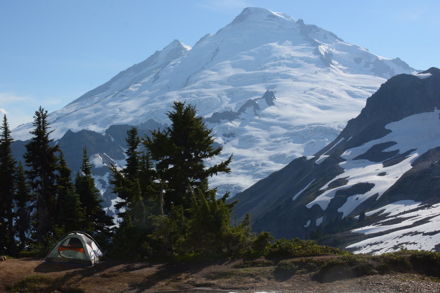 The ridge trail opens with descending switchbacks, a short sturdy steep snowfield or two, then an ascent along surreal moon-like volcanic rock and more exhausting uphill snowfields. The trail flattens out, ringed with meadow grass and blooming purple lupine. Many people camped in those first 1 ½ miles, where there’s snow for water, the campsites are broken in, and the views of the North Cascades are already amazing. We wanted to see where the trail led, though. So we marched another 2 ½ miles or so, over rock and intermittent snow, to something resembling solitude at Camp Kiser, as Baker grew bigger, and grander, and more majestic. We pitched a tent beside an illegal campfire ring, behind trees that sheltered the wind, a good distance from everyone else on the plateau. Right by our camp we had a trickle of a snowmelt stream, deep enough to pump water, when needed. Around 5 p.m. we took off for the Portals, and while most maps say there’s no trail, it’s well-established. All along that ridgeline are camps with amazing views, and while water is scarce, there’s lots of snow to melt. (But not much to cross.) No one camped above the first ridge — and I wonder why, because the highest sites have the best views. We hit the trail terminus around 6:30 p.m., hung out for a bit, and climbed back hungry for dinner. We barely stayed up for leftover Perseid meteors.