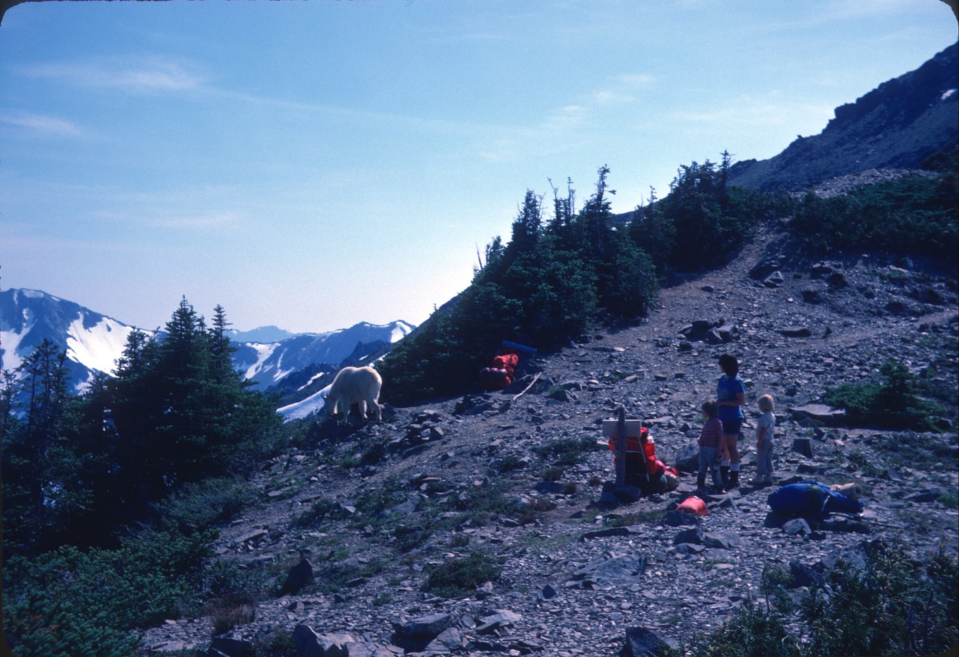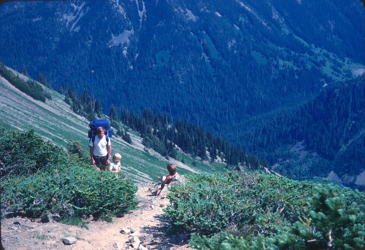 So after exploring Cameron Creek we still had to hike up and over Grand Pass to our assigned campsite on Moose Lake. It is a very steep trail going up the south side of the pass and we now wonder how we ever got our young daughters up it. Just a smidgeon of snow remaining on the north side of the pass and a good trail down to the lakes.