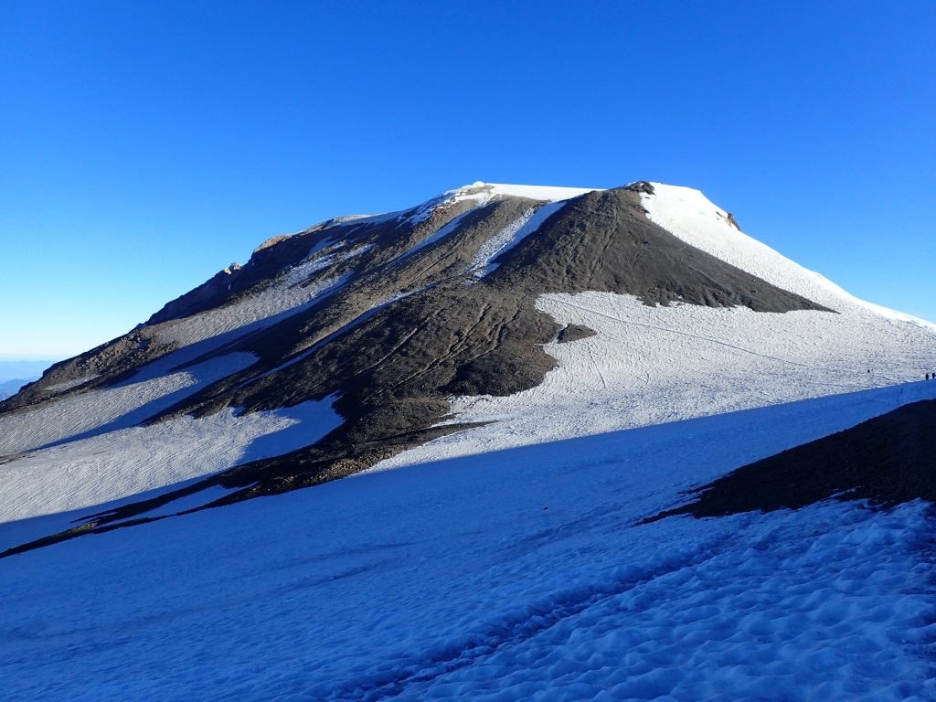 We stayed on the summit for maybe 30 minutes. It was pretty cold, just barely above freezing, but not windy, fortunately. Then we descended. It took us longer than expected, because the snow was so hard that we couldn't glissade down on it. We tried at one point, a little ways down from the top, where it was safe, but the snow was so hard, we got bruises on our butts. So we had to hike three hours down to camp. The last bit we were able to glissade again. There, we cooked some noodle soup, took a 20 minute nap, and then packed everything up.