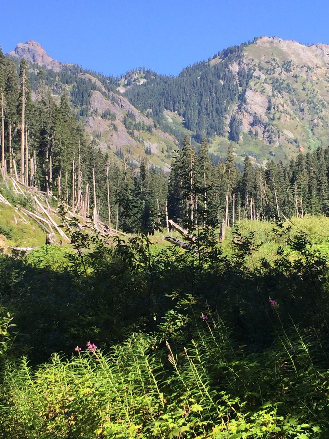We had about a half day for a hike so we chose this fairly flat eight mile round trip to the creek crossing just beyond the large avalanche clearing. This is a nice turnaround and lunch spot in the rocks at the creek. There are still some wildflowers and spots of fall color now on the hillsides. There are good views up toward Rampart Ridge, Alta Mt, and on the other side up to the PCT hillsides far above. We saw only two other hikers in the 3+ hours we were on the hike. This trail gets little traffic, maybe because of the half hour of road you have to walk each way.