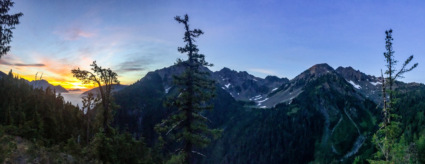 Day 4 (Sunday) - 19.1 Miles from Marmot Lake to Staircase. We woke up at 6am to find that the smoke and fog had FINALLY cleared, and we were greeted by a beautiful sunrise! There's a high point 100 feet south of Marmot Lake by the Bear Line that has a gorgeous view over the valley 1,500 feet below. We could hear some elk calls in the distance, but the sunrise and thin wispy clouds were definitely the highlight. We packed up and hit the road by 8:30am, with the initial plan being to stop at Camp Pleasant. Unfortunately the majority of this trail was much like O'Neil Pass; thin, overgrown and full of rough / jagged small rocks that moved our feet around ever so slightly in our boots, making yesterdays blisters even worse. First Divide was an amazing view at the top, and Home Sweet Home was a camp that made us jealous with it's huge open meadows at the top of a valley with 5,500 ft mountains above. By halfway down first Divide, we were so beat up that we knew if we tried to hike again the next day we might not make it, so we decided to push our bodies to the limit and just make it home to Staircase, giving us an extra day for our bodies to recover before heading back to work. This may have been the greatest and dumbest decision we've ever made while hiking, as our bodies were pushed to the limits, but it made for a great story!