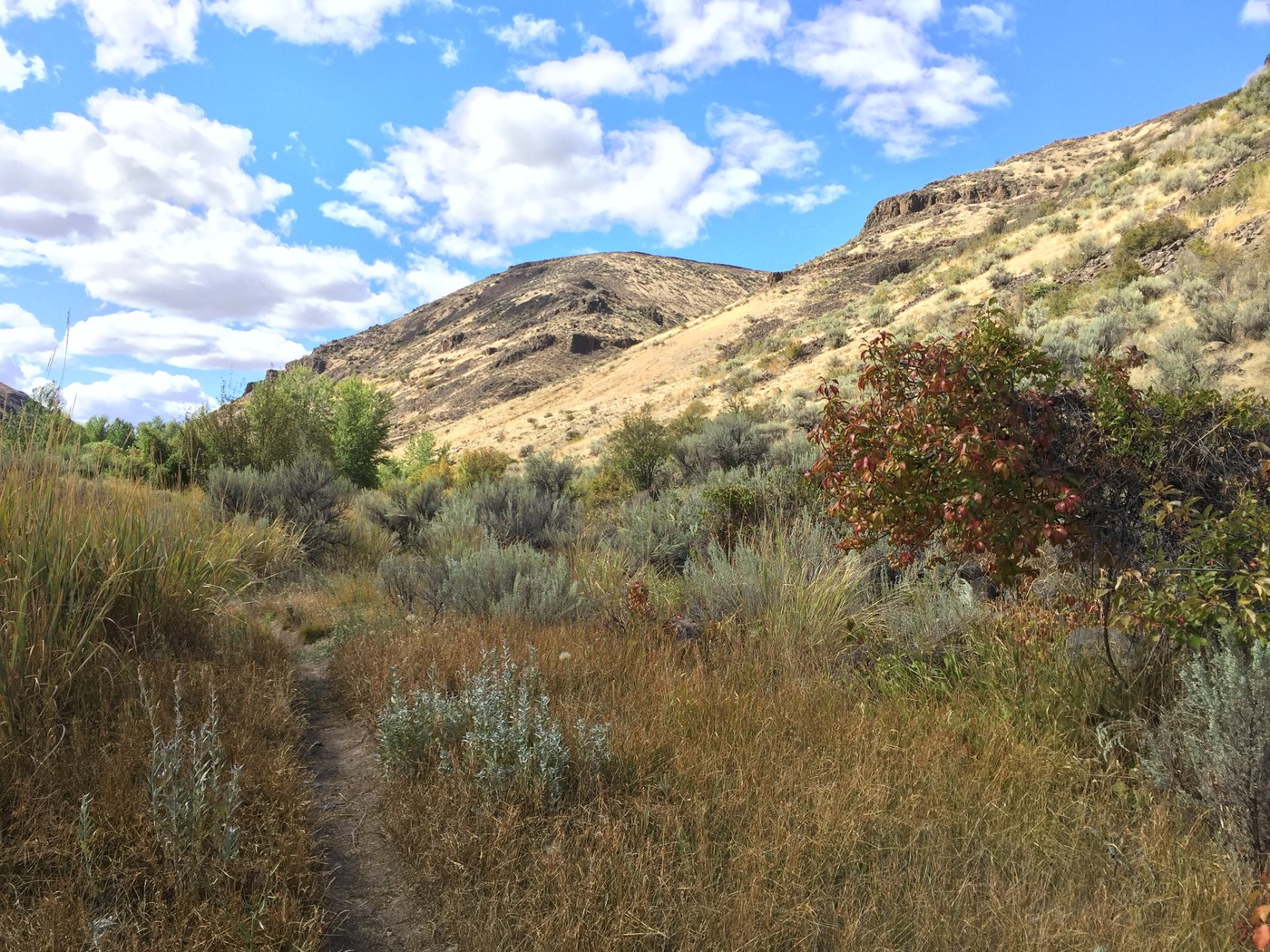 This was a pit stop on my way home to Shoreline from Goldendale. I've wanted to hike this trail so it was a perfect half way spot to stretch the legs with the dog. One thing to know is when you cross the bridge go under the railroad tracks turn left and then go right and you'll come to a trail sign. This is the fork in the road that determines what trail you want to do. Easy is straight behind the sign. Harder up into the hills go left. I choose the easy way. The minor obstacles along the way is keeping track of the trail. About a mile in I crossed the creek, thanks to a couple who pointed the way, and proceeded to go another mile. I could have kept going another mile and a half but already I bushwhacked enough for the day. Very overgrown in places but doable as long as you go the correct way, which appears from other trip reports and other people I met on the trail today, is a problem. It was a great hike other than keeping track of the trail. I was really hoping to see Big Horn Sheep but all I saw was a huge deer I scared. Next time I'll try the other trail and go up higher in the hills. I'm glad it wasn't too hot today otherwise I'm sure the hike would have been worse, especially for the dog. I'll be coming back to this hike, especially when the wildflowers are out.