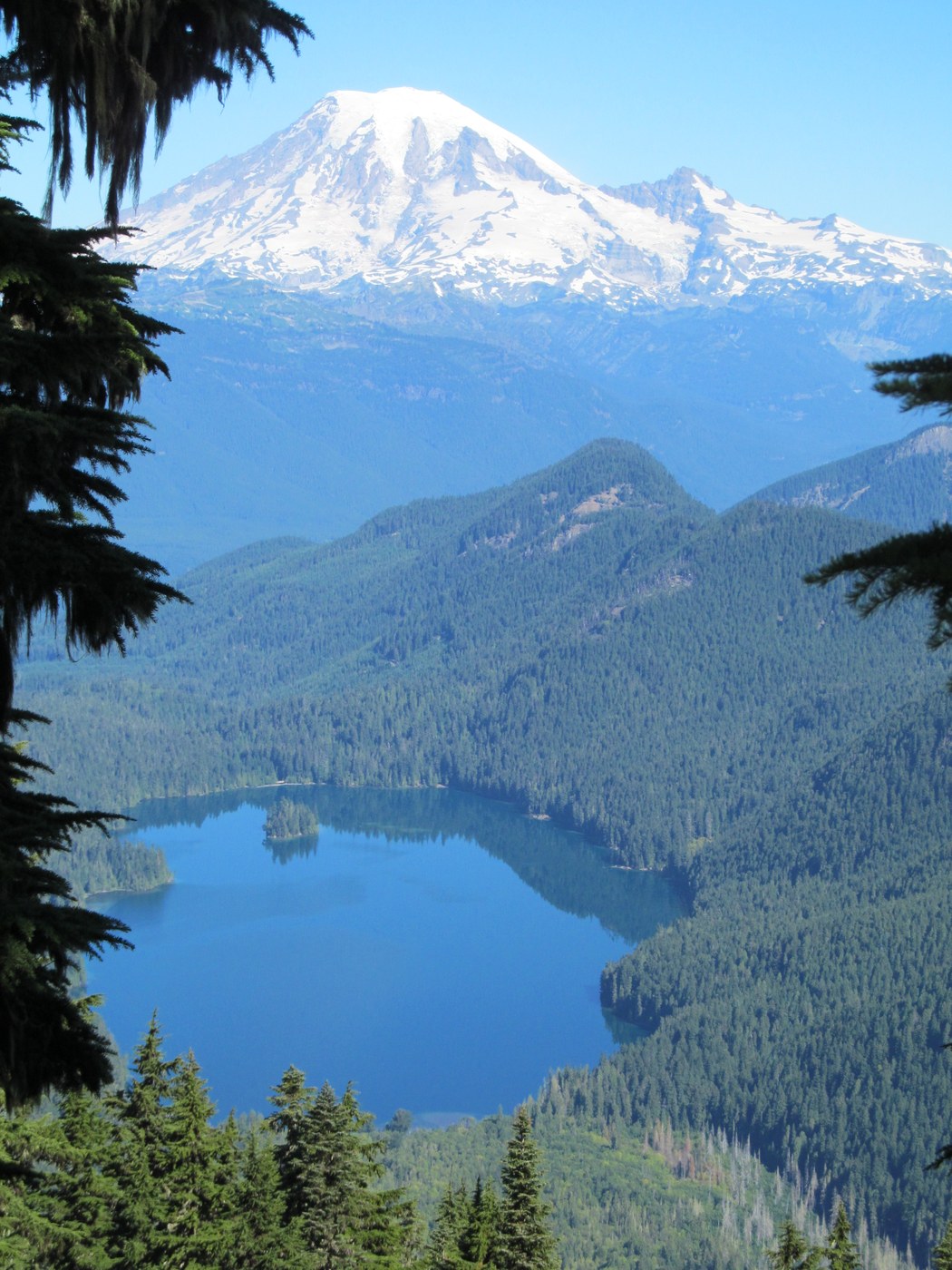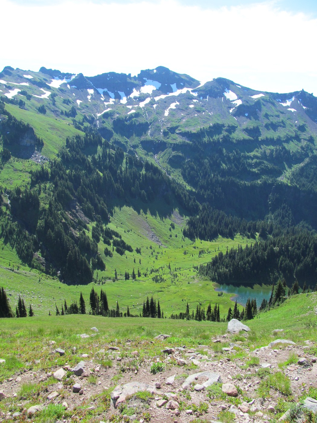 Lily Basin trail to Heart Lake. Original trip plan was to complete loop and come out at Packwood Lake on 7 day trip. Poor weather first two days shrouded landscape in mist, rain and clouds. Washout of trail a couple miles before Heart Lake made for logistical problem solving to get group down one side and up the other. Spent first night at Heart Lake. On second day climbed above the lake on open slopes toward Chimney Rock, Goat Lake. Began to hit more and more difficult snow fields, finally reaching a very large one with steepness that looked too difficult for a large group to safely cross. Returned to Heart Lake for another night. Weather improved dramatically and we enjoyed warm sunny climes in the meadows to dry out clothes and gear. Hiked out the following morning and ended the trip with two days at Packwood Lake instead--did Lost Lake as a side hike from there.