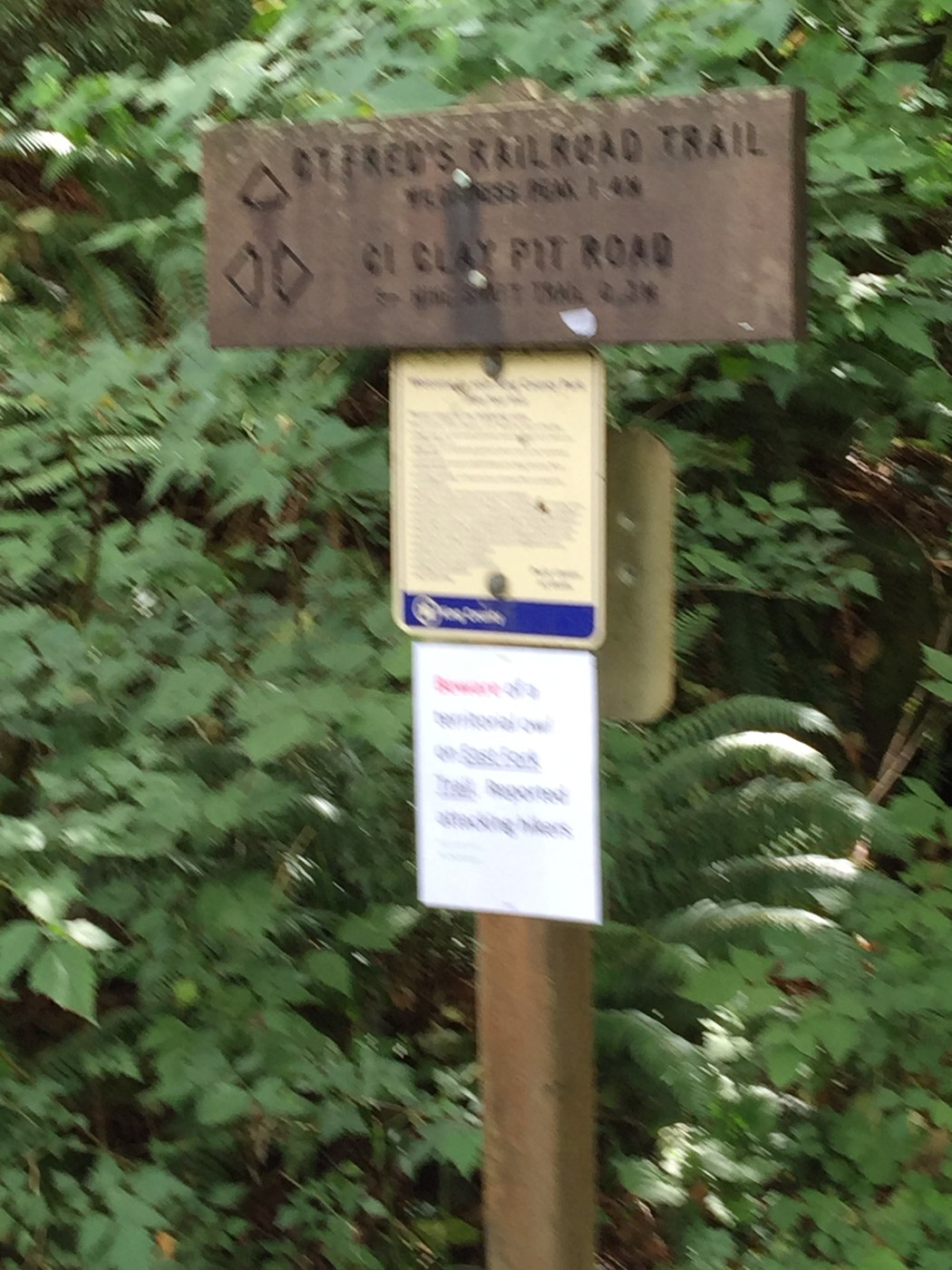 There is a note on the East Fork Trail (off Fred's Railroad) of a protective owl that has attacked hikers on this trail. I did not see the bird but did see plenty of warnings.