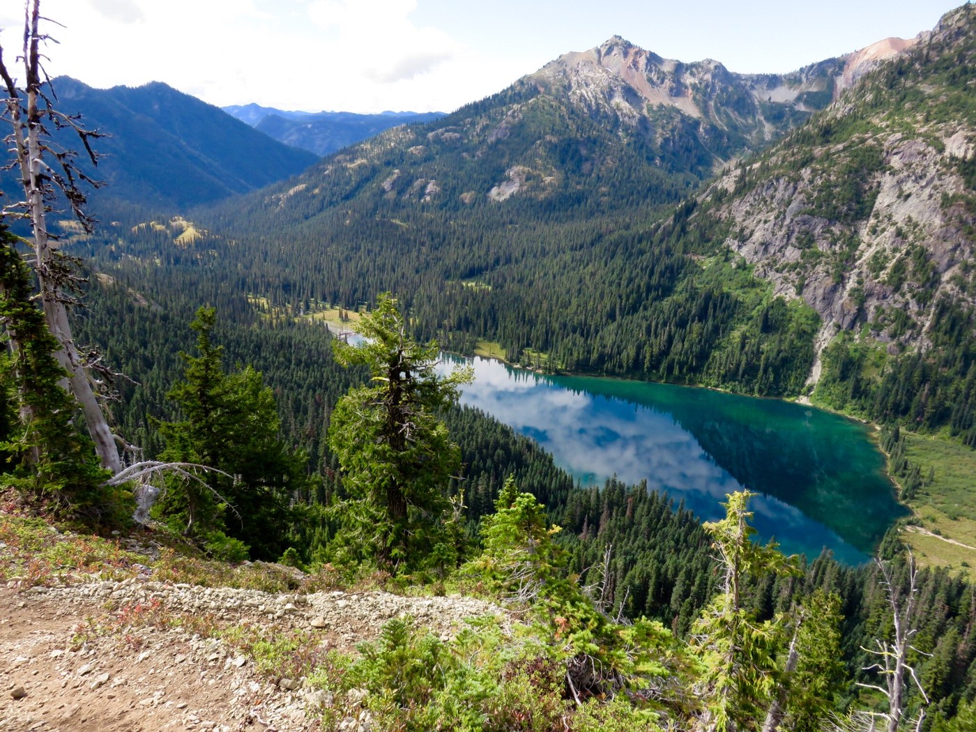 Our Volunteer Vacation crew of eleven arrived at the Tucquala Meadows trailhead early on Saturday morning to find a very crowded parking area (Labor Day weekend!). The climb up to Squaw Lake is relentlessly UP, though there are only a few really strenuous sections. The lake is quite pretty, and there are nice views across the valley from the pika village on the talus slope. The blueberries were abundant and ripe, yum! Fall has definitely arrived at this elevation, with evening temps dropping into the mid-thirties. We had on-and-off showers until Friday, when it finally warmed up enough for us to enjoy some swimming and "basking" time in the afternoon. We managed to do a good deal of tread and drainage repair. The hike up to Cathedral Rock and Peggy's Pond is easy from Squaw Lake and offers great views.