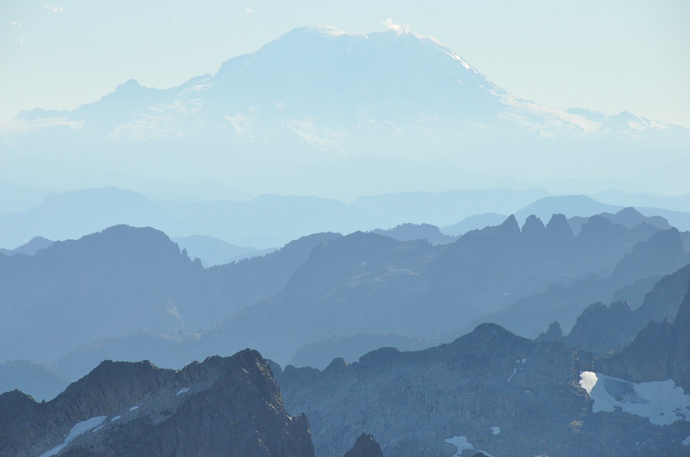 We gained Hinman's western ridge and were rewarded with spectacular views all around. Just breathtaking on a cloudless late September day. Adams, Rainier, Bear's Breast, Chimney Rock, Overcoat, Baring, Glacier, Monte Cristo range, Baker, Three Fingers, Pilchuck, Index, and more, and more, and more and lots more...