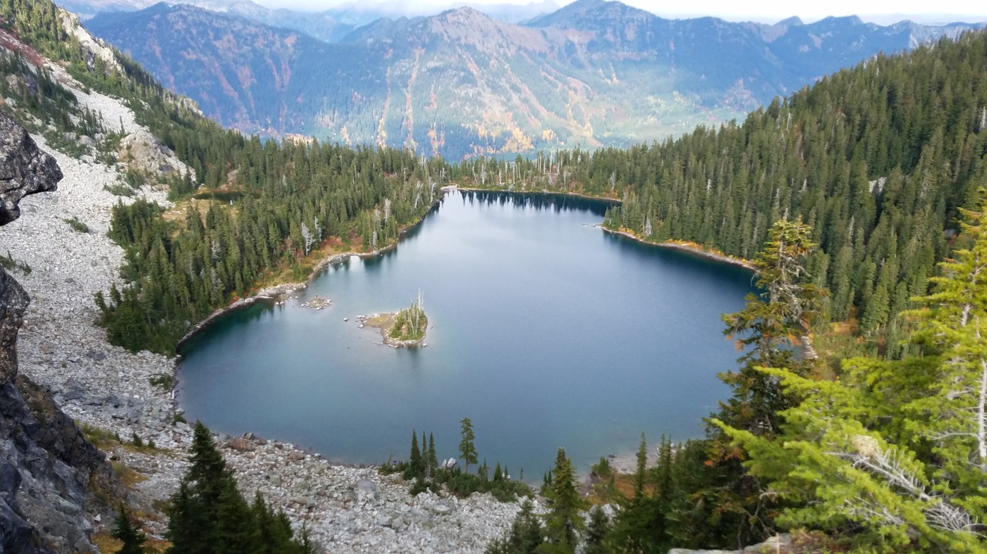 Well the payoff at the end was well worth it! The view of Minotaur was fantastic. We took the trail to the right, crossing the creek, and headed up (again) to catch the view of Theseus. Theseus was spectacular. We caught the best view as the sunbeams were popping out between clouds. We ate lunch on a rock overlooking Theseus and spent some time exploring this peninsula. One chipmunk came out to inspect our lunch.