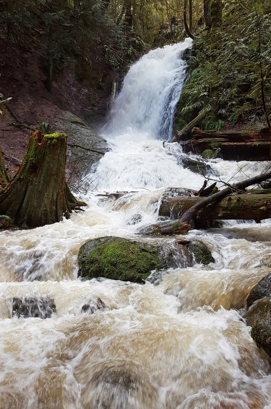 After a record rainfall yesterday we decided to check out Coal Creek Falls. Our original plan was to make a loop starting on the Wildside trail but unfortunately the trail was covered in 6 inches of fast running water just before the 1st bridge. We tried the Steam Hoist trail but it was also flooded. Back to the Red Town Trail which just had a few small stream crossings. We did a short side trip to Far Country Falls before heading up the Quarry trail to the Coal Creek Falls trail. The falls were flowing better than I've ever seen. Not at all crowded on this pleasant Thursday.
